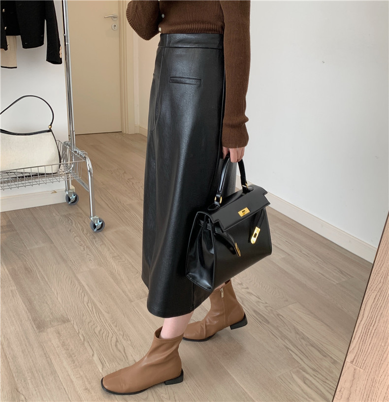 Black PU Leather Skirt Autumn Winter High-end Design Sense High Waist Straight Tube Open Fork Environmental Protection Leather Package Butt Half Skirt Medium-long Skirt