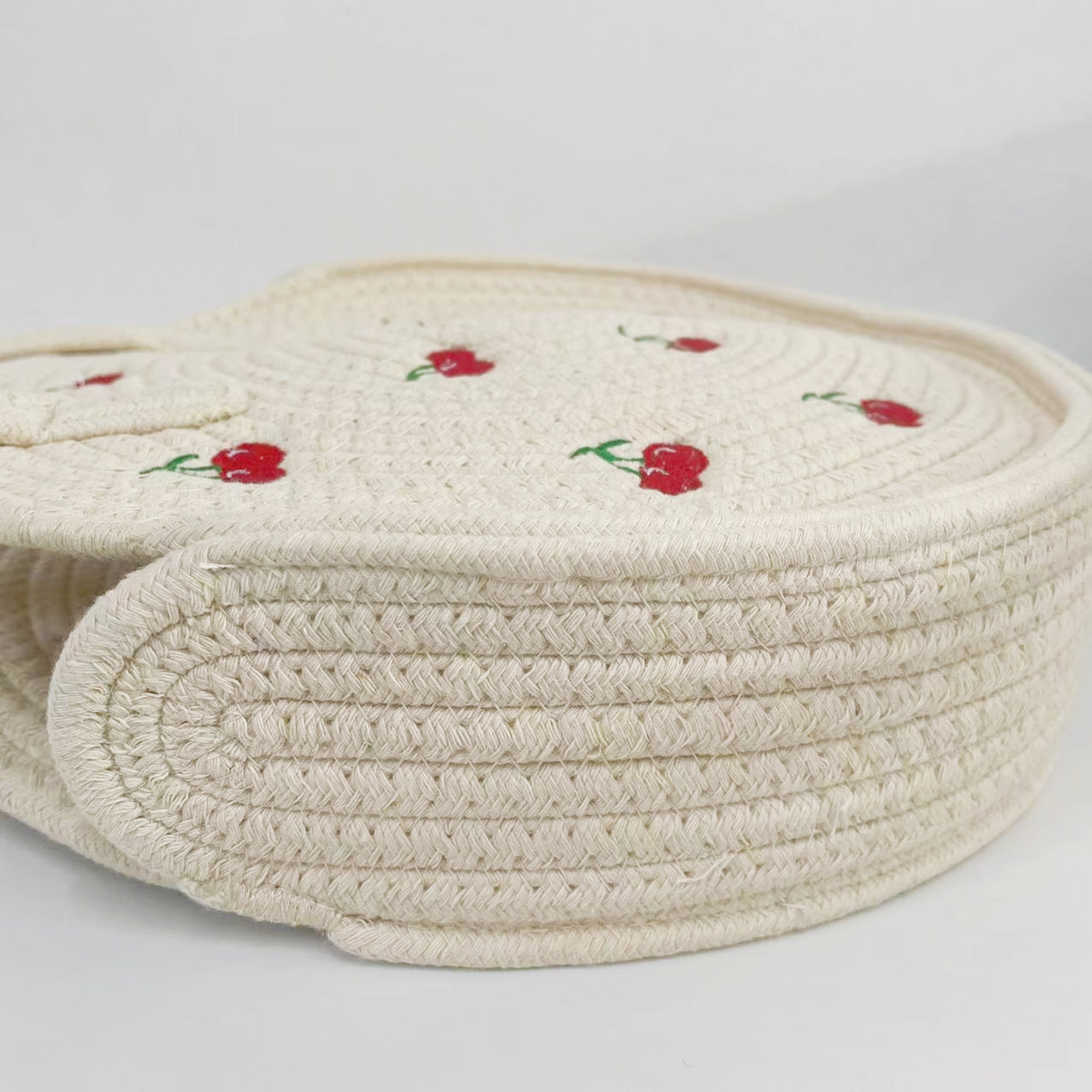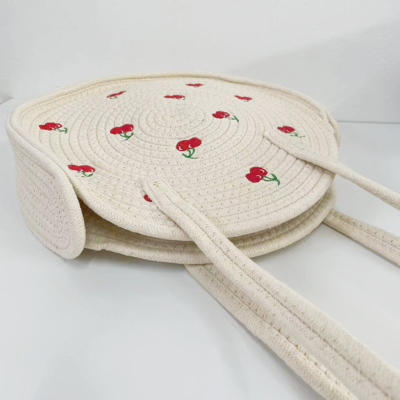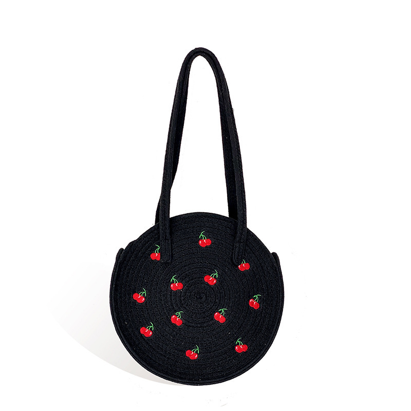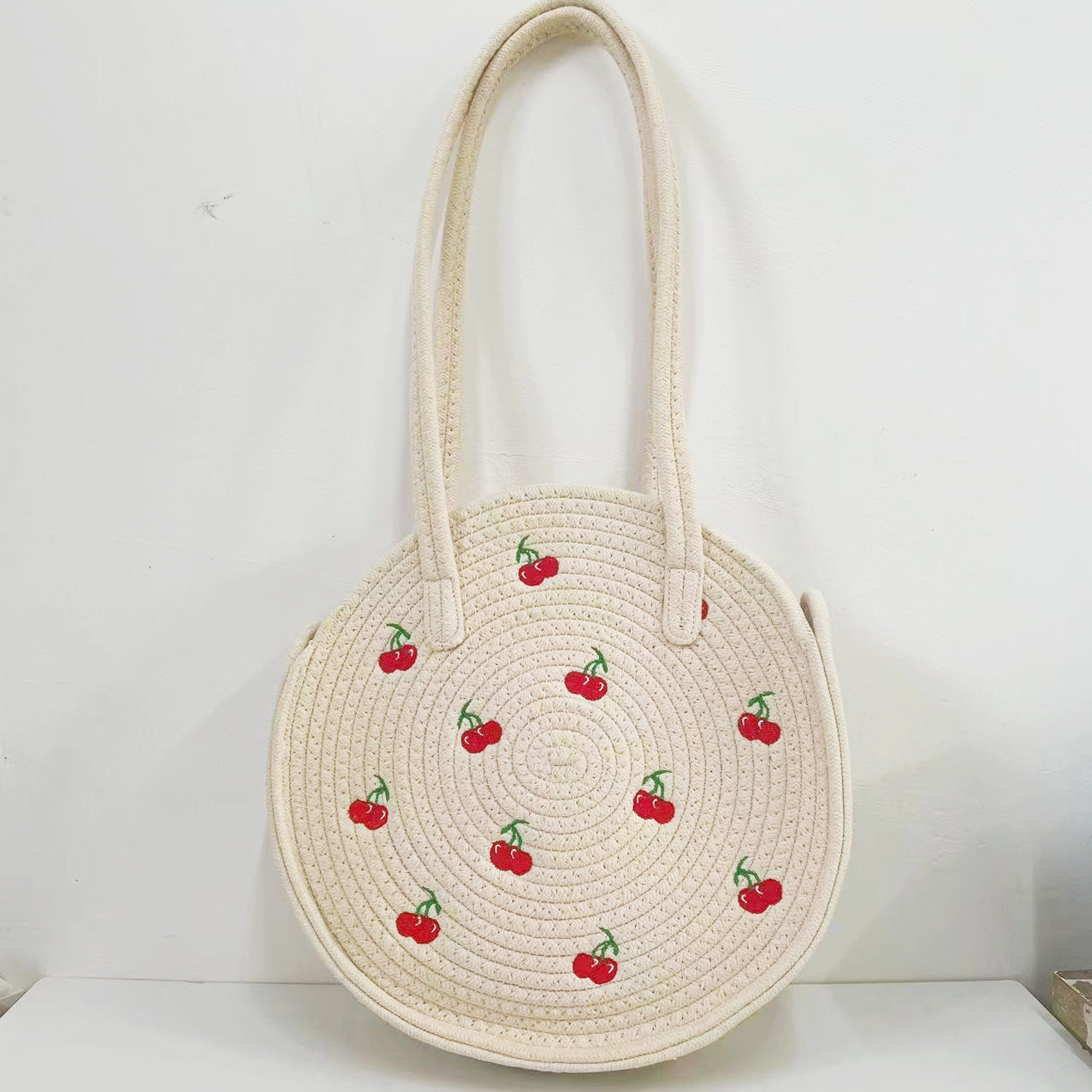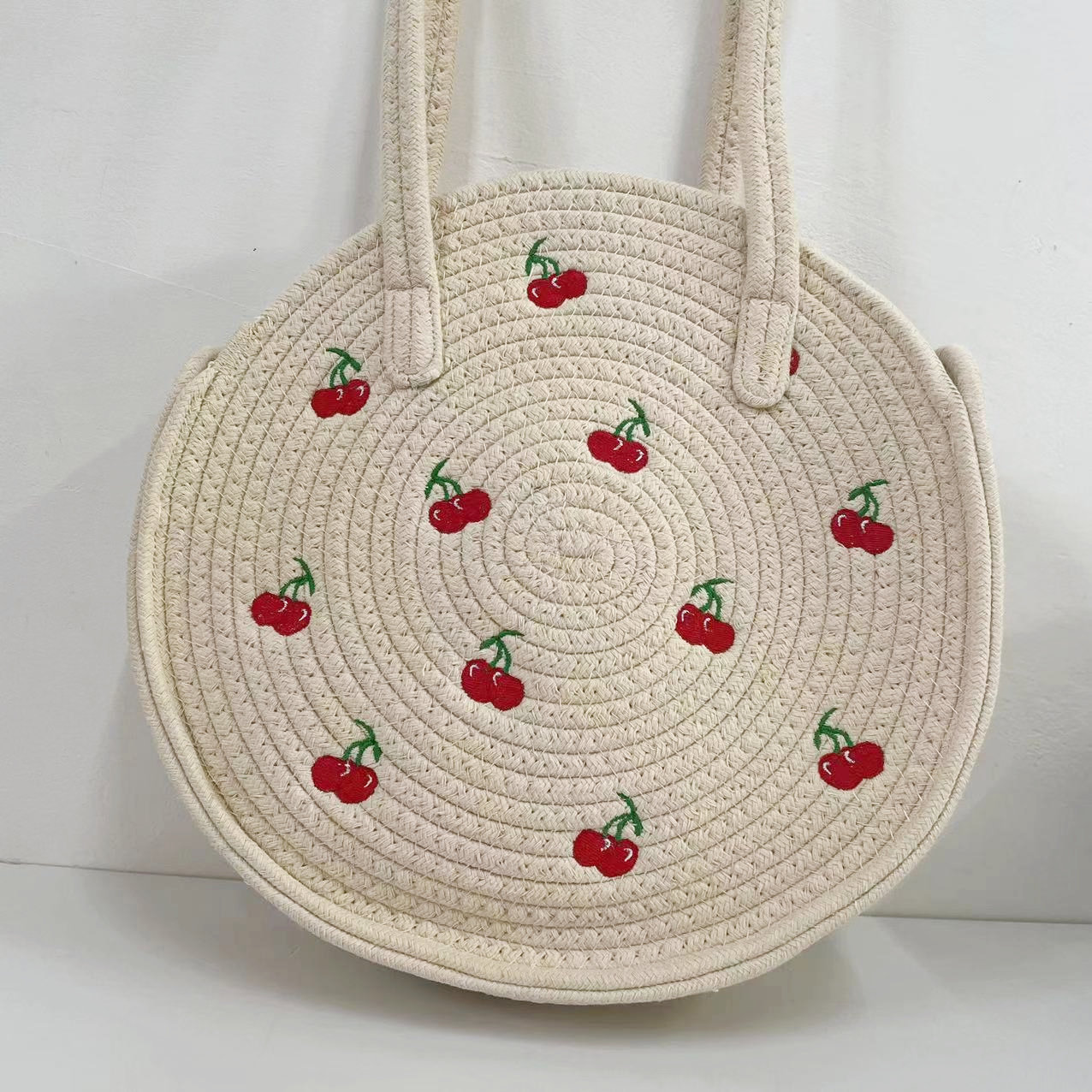 Korean ins Artistic Fresh and Lovely Beach Embroidery Cherry Knitting Bag, Round Tote Bag, Straw Weaving Bag