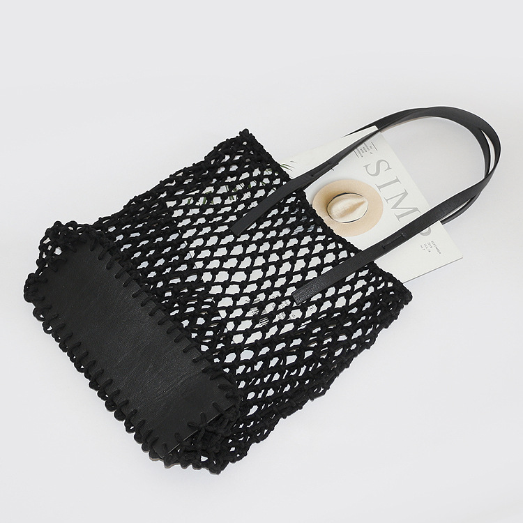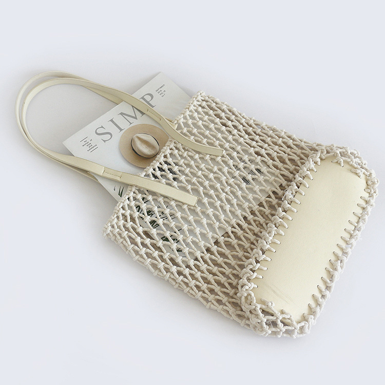 Women Shoulder Bag - Hollow Rectangular PU Bottom Cotton Rope Knitting Bag for Vacation