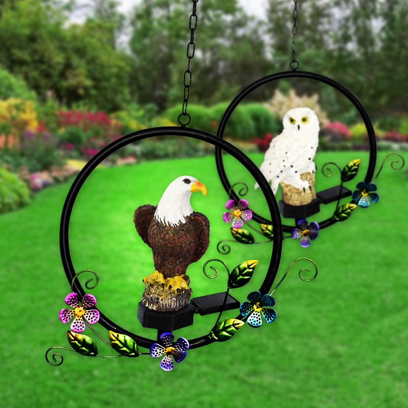 This solar light cat head eagle iron art wind bell pendant decoration is perfect for outdoor decoration. It is waterproof and certified by European CE, with a long lifespan of 6-12 hours. It is IP55 rated and has a power efficiency of 0.72. It is suitable for gardens, animals, and people. It is also equipped with a sensitive switch and a lifespan of 6-8 hours. It is a great choice for outdoor decoration.
