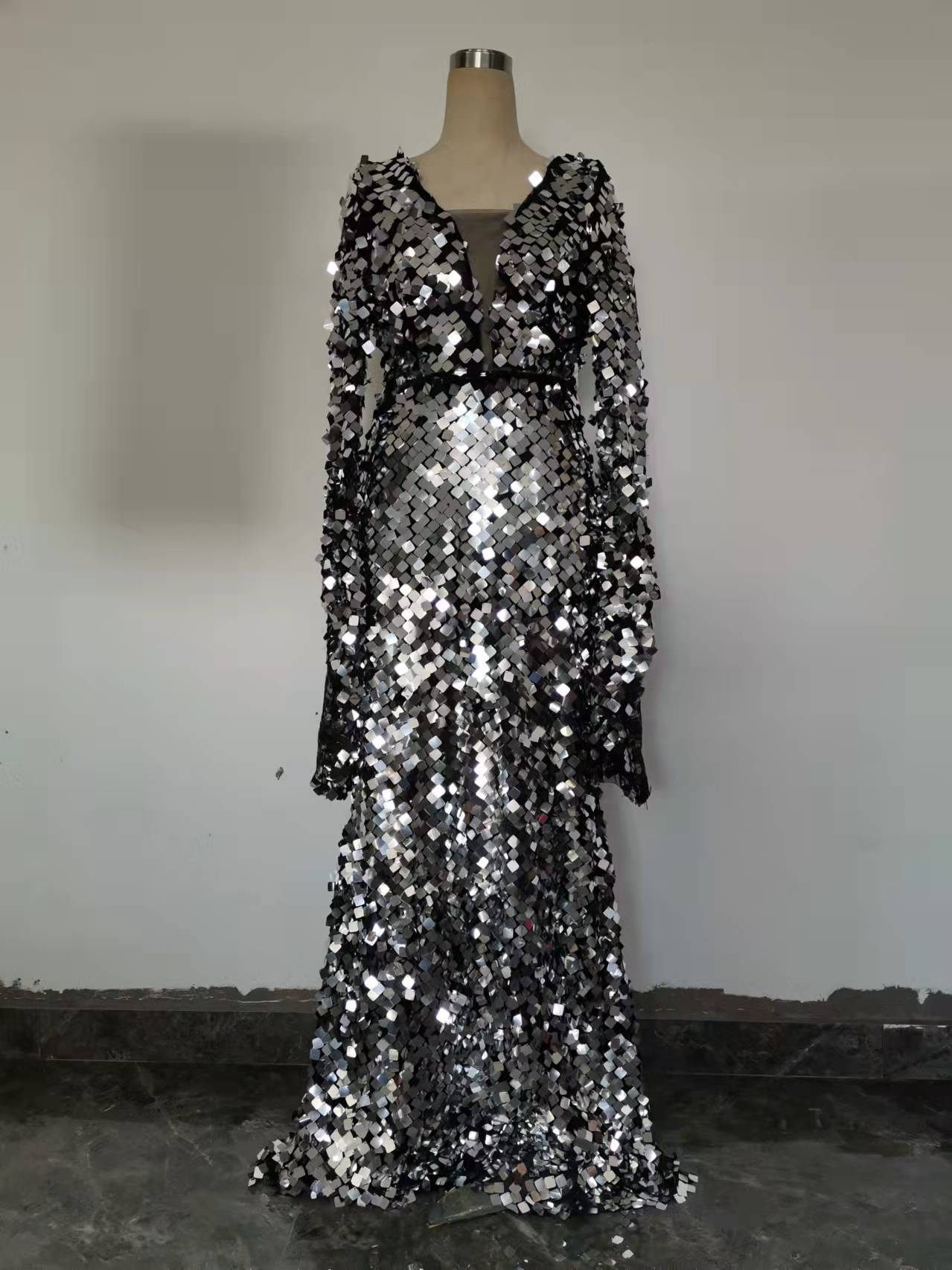 Women's Sexy Silver Sparkle Dress with Long Train for Formal Occasion