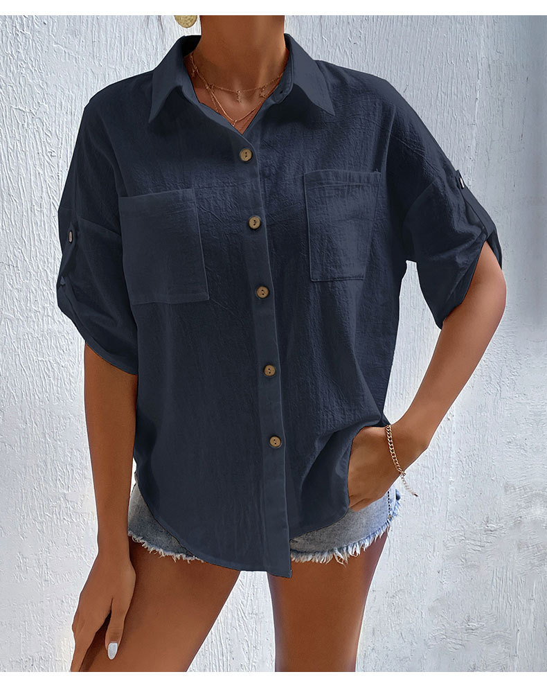 Summer New Style Button Open Cardigan Top with Pocket and Turn-down Collar
