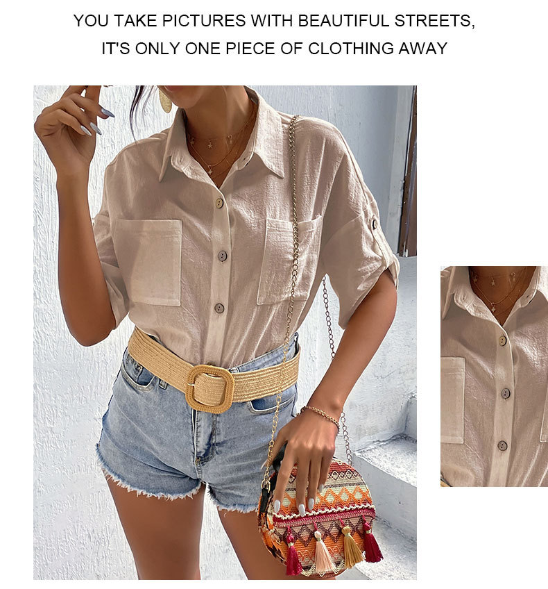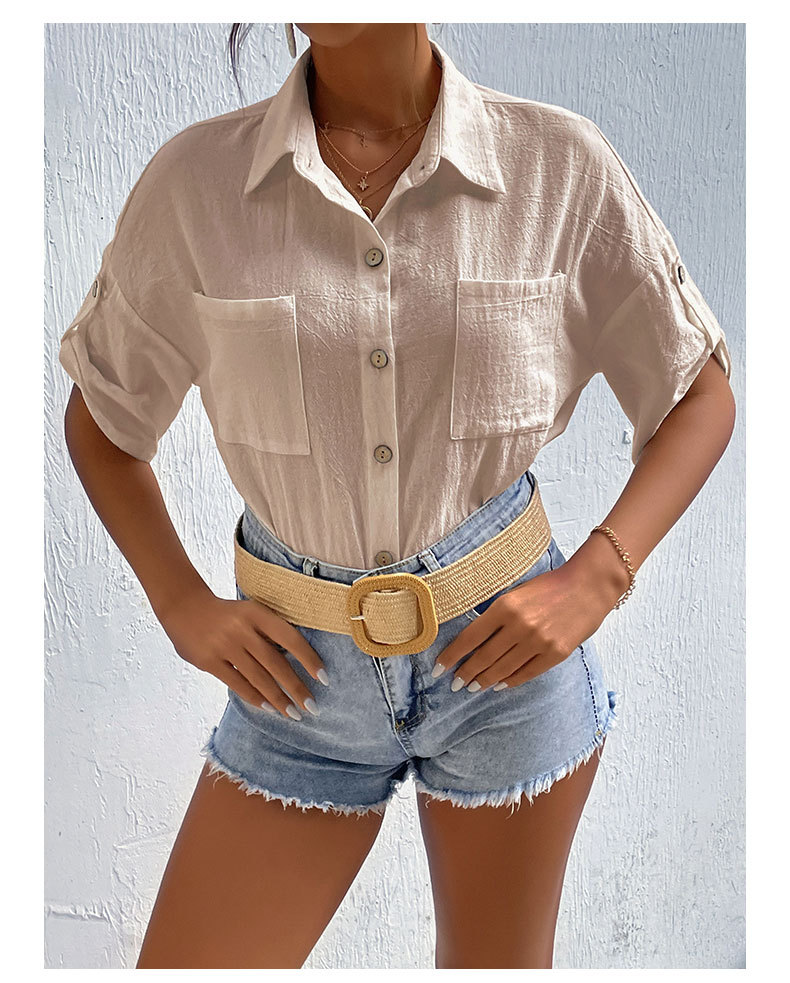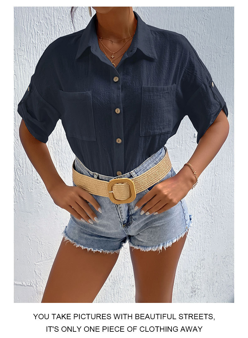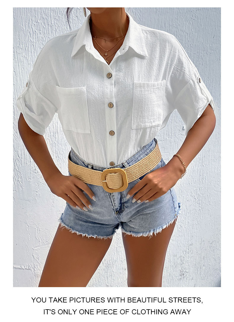 {"Cut":"Loose","Style":"Commuter Style","Length":"Regular (50cm < Length ≤ 65cm)","Pattern":"Solid Color","Placket":"Single-breasted with multiple buttons","Style Type":"Atmospheric Commuting","Collar Type":"Turn-down Collar","Fabric Name":"Polyester","Sleeve Type":"Regular Sleeve","Craftsmanship":"Pasting/Piecing","Sleeve Length":"Short Sleeve","Fashion Element":"Piecing","Cross-border Style Type":"Elegant Temperament","Main Fabric Composition":"Polyester (Polyester Fiber)","Main Fabric Composition Content":"95% and above"}