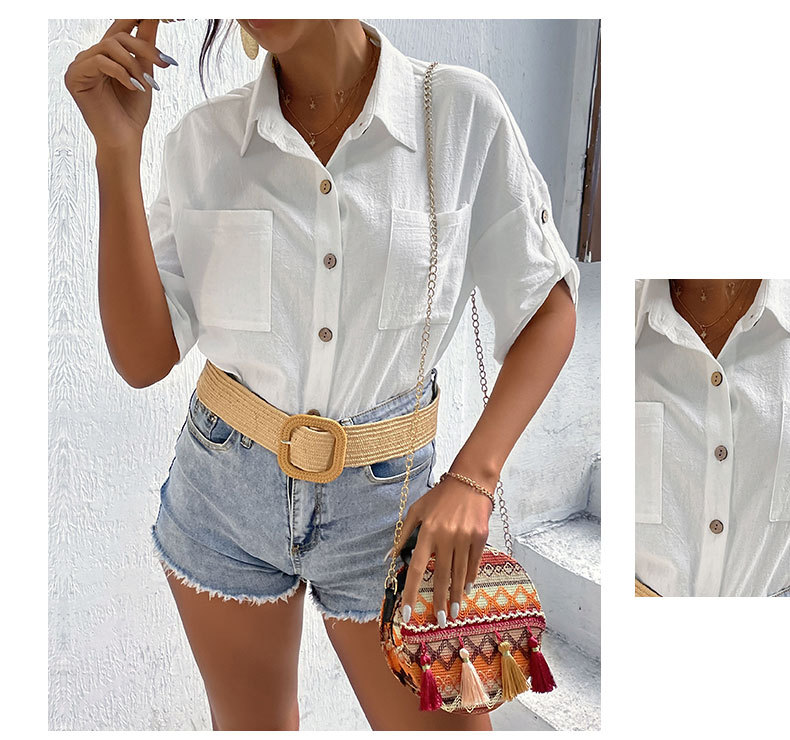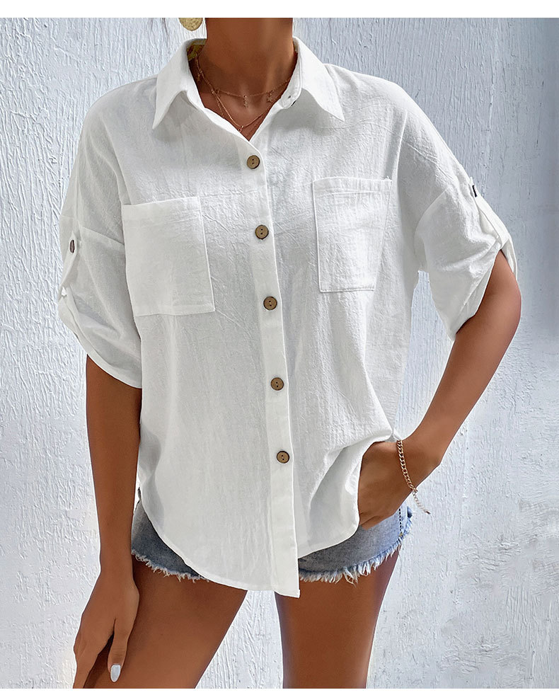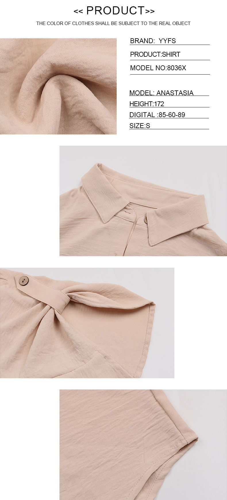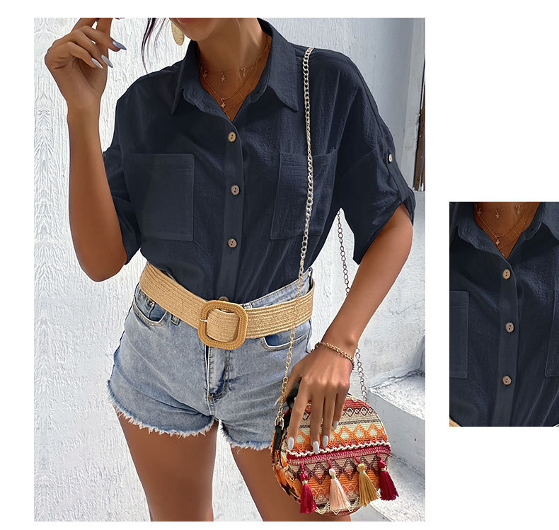 {"Cut":"Loose","Style":"Commuter Style","Length":"Regular (50cm < Length ≤ 65cm)","Pattern":"Solid Color","Placket":"Single-breasted with multiple buttons","Style Type":"Atmospheric Commuting","Collar Type":"Turn-down Collar","Fabric Name":"Polyester","Sleeve Type":"Regular Sleeve","Craftsmanship":"Pasting/Piecing","Sleeve Length":"Short Sleeve","Fashion Element":"Piecing","Cross-border Style Type":"Elegant Temperament","Main Fabric Composition":"Polyester (Polyester Fiber)","Main Fabric Composition Content":"95% and above"}