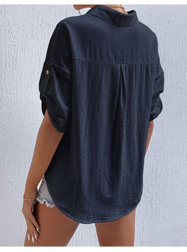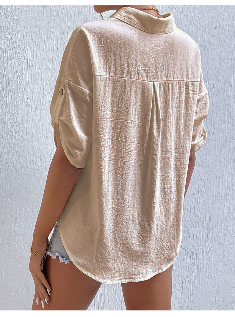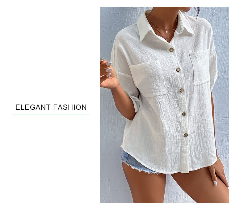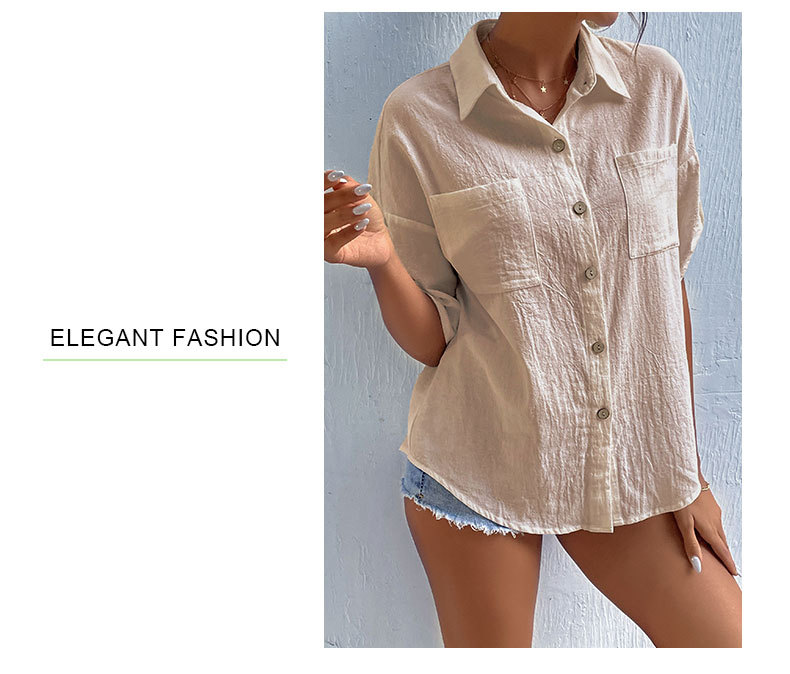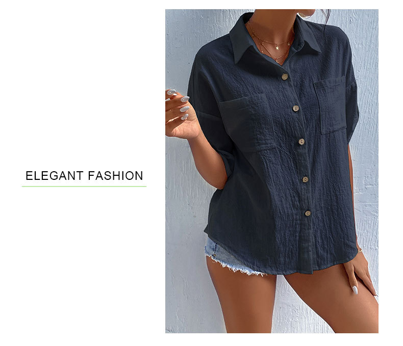 - ["Made of high-quality linen material, soft and breathable","Features a pocket and turn-down collar","Loose fit and short length design","Solid color and short sleeve","Suitable for summer and casual wear"]