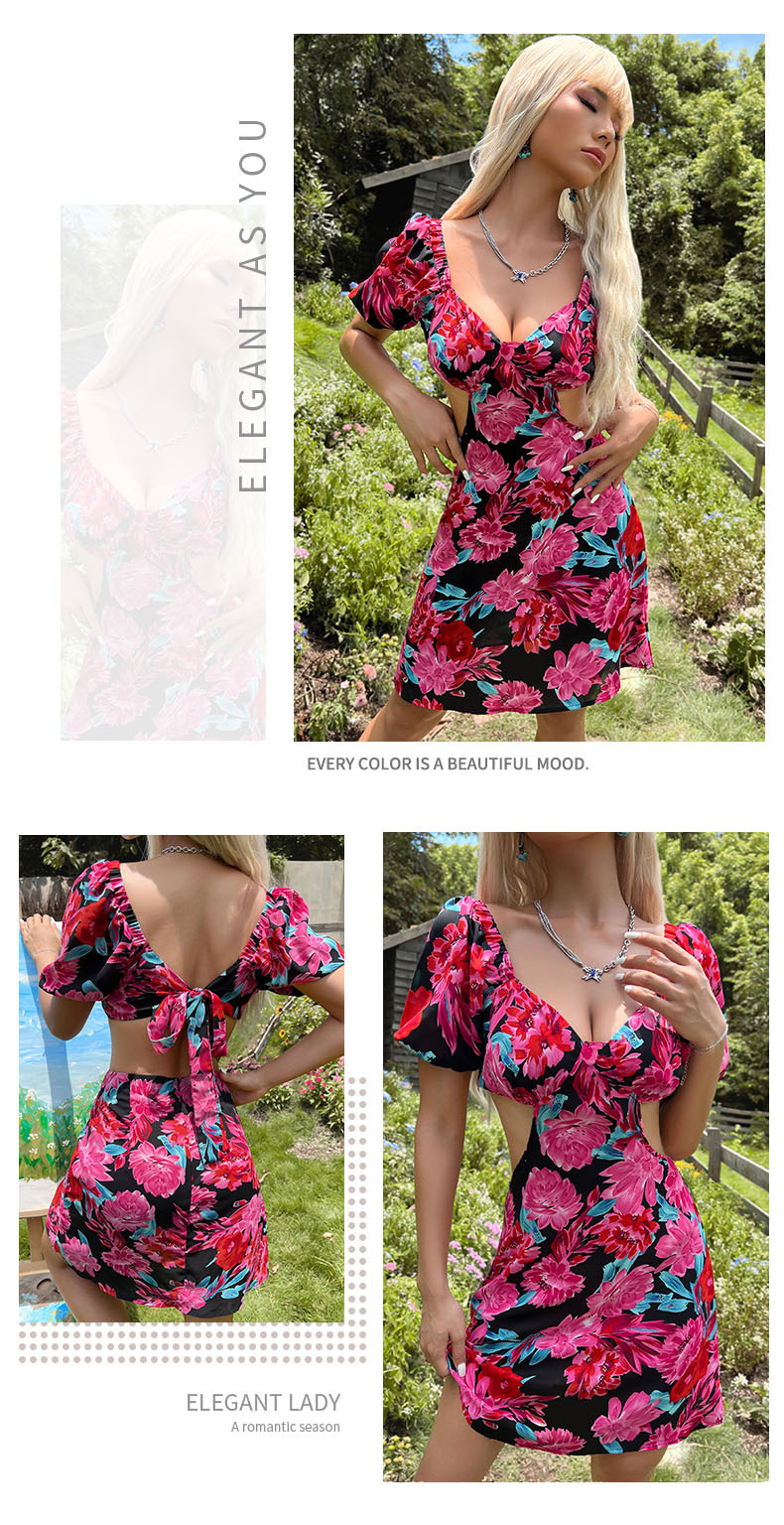 - ["Made of high quality cotton blend material","Features a fashionable floral pattern","A-Line style with V-Neck design","Short length with hollow out design","Perfect for sweet girls in summer"]
