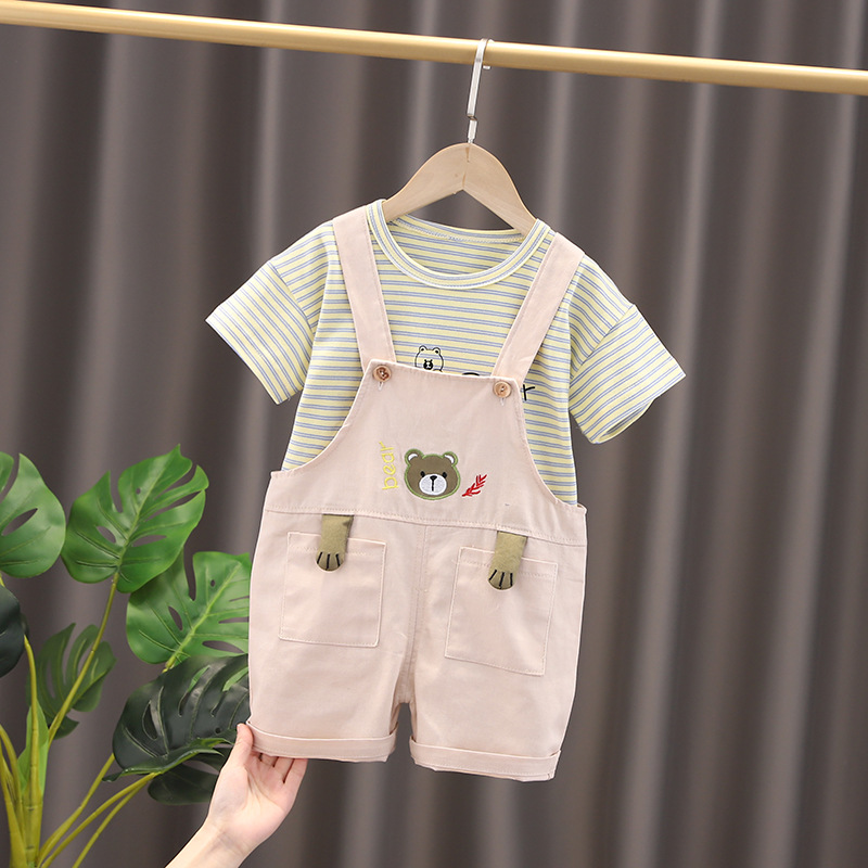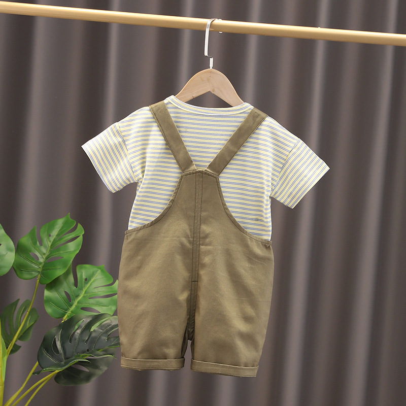 - ["Made from lightweight and breathable fabric","Features a striped pattern","Comes with a round neck and short sleeves","Includes a suspender pants suit","Suitable for kids aged 1-3 years and 80-100cm"]