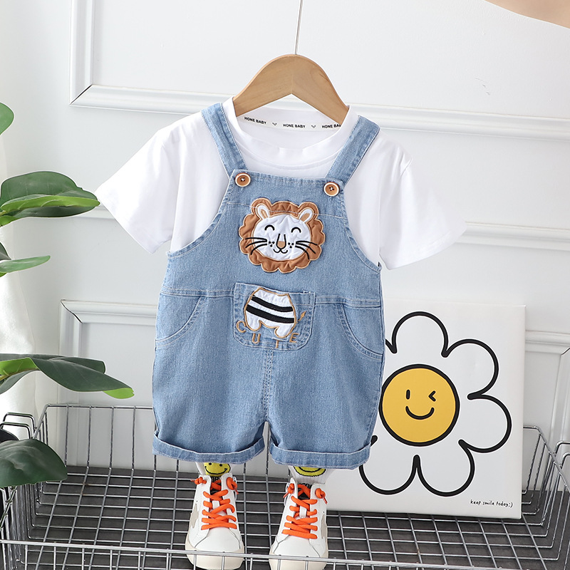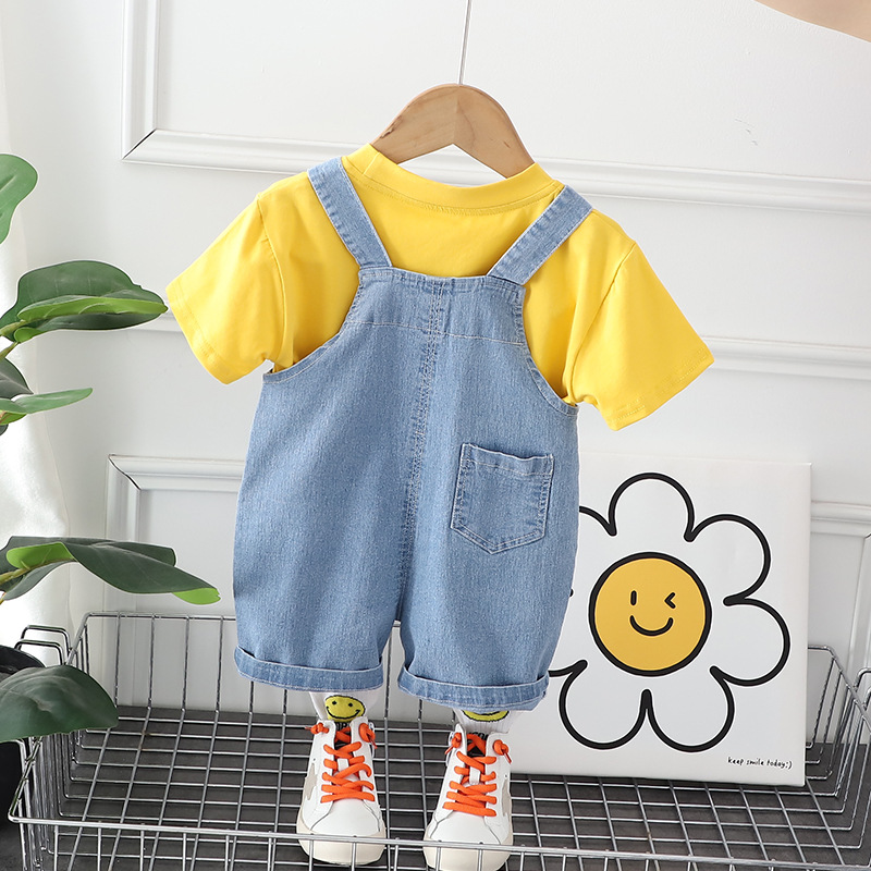 - ["Made from high-quality denim fabric for comfort and durability","Features a round neck and short sleeve for a stylish look","Comes with belt loops for a secure fit","Available in a range of sizes to fit kids aged 1-3 years","Perfect for summer days and casual wear"]