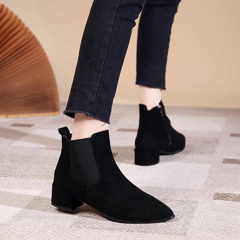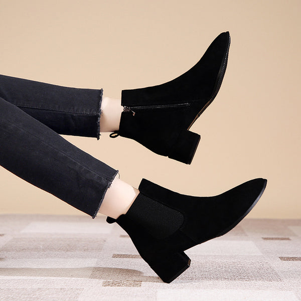 Botas de tacón de terciopelo negro PU femenino con cremallera lateral, dedo del pie puntiagudo y tacón grueso