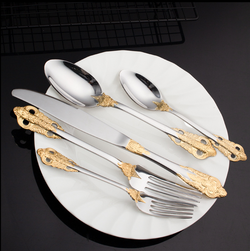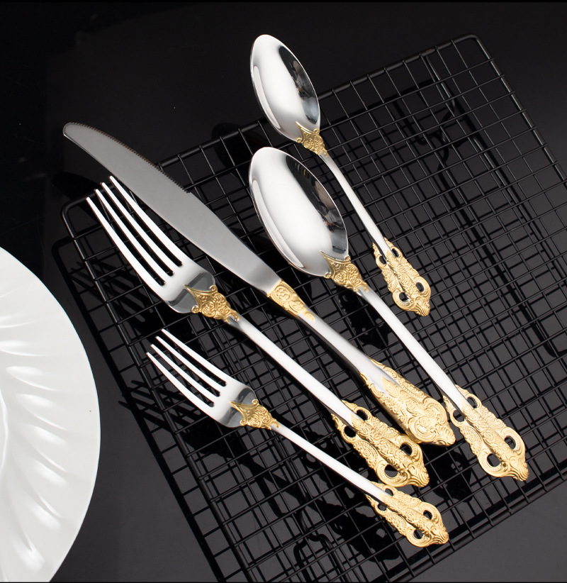 - ["Made of 304 stainless steel, this 5-piece cutlery set is durable and rust-resistant","Intricate engraving and embossed light design give it a unique and elegant look","Lightweight design makes it easy to use and carry","Suitable for adults, perfect for wedding, birthday, festival, celebration, advertising promotion, employee benefits, anniversary, business gifts, opening ceremony, awards ceremony","Palace style, perfect for any occasion"]