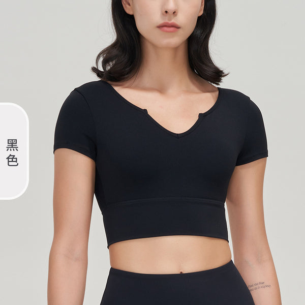 Top de cuello en V de yoga para mujeres con almohadilla para el pecho para correr y hacer ejercicio, ajuste delgado, manga corta
