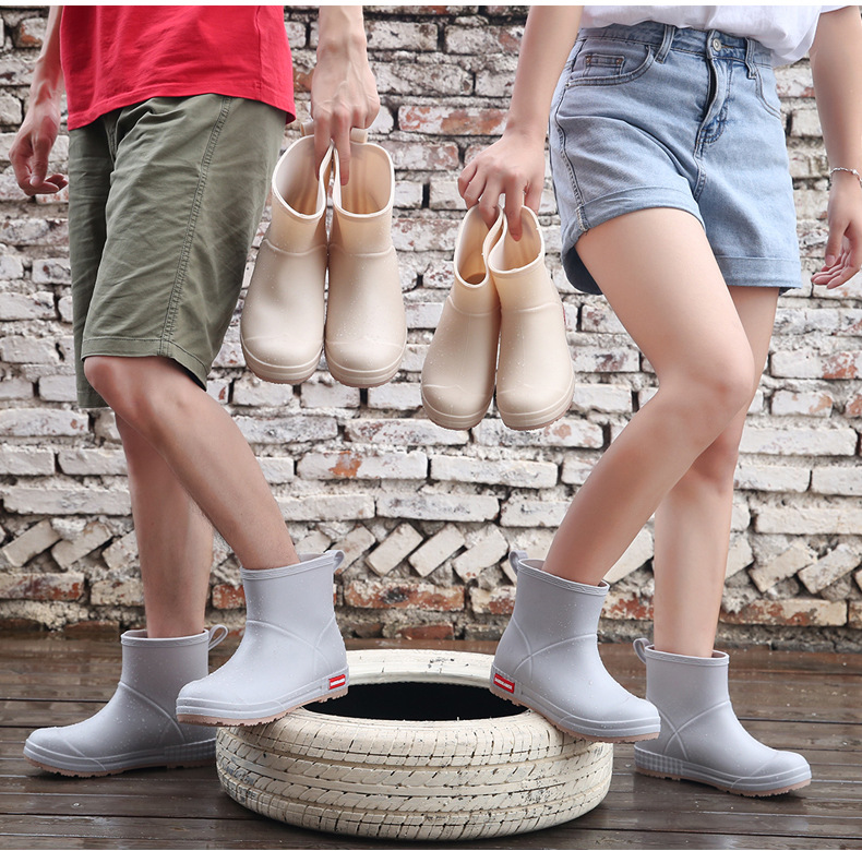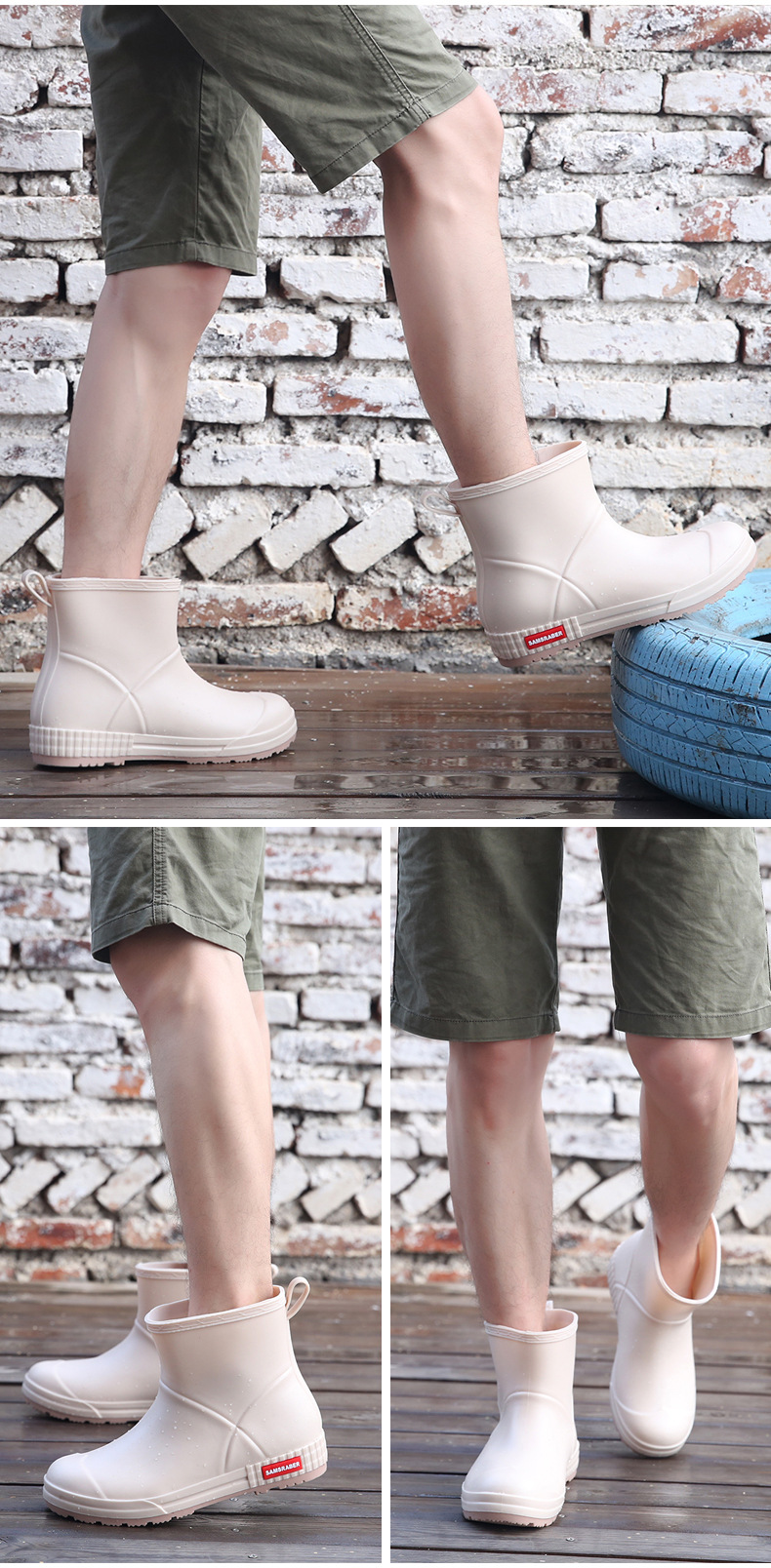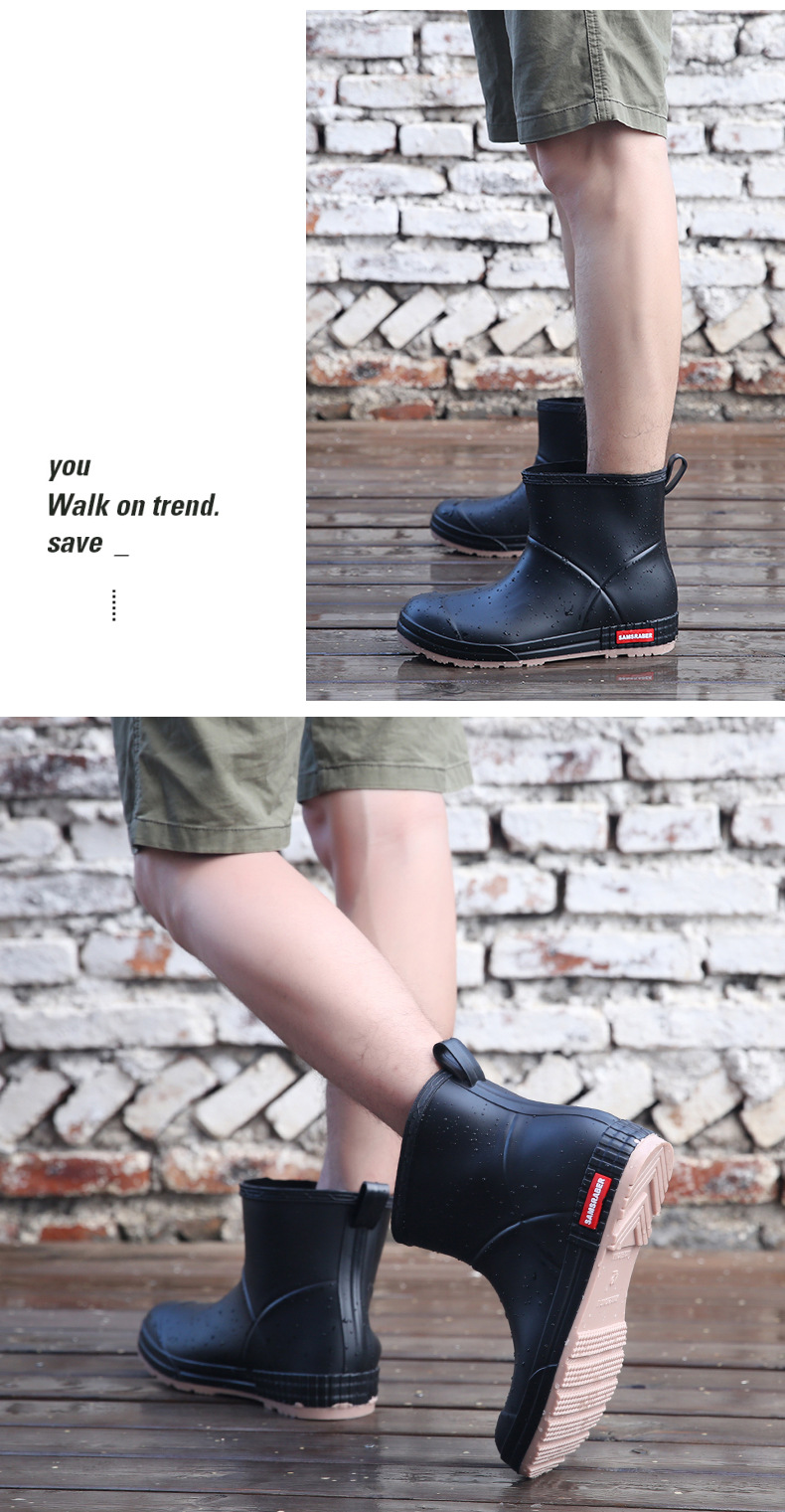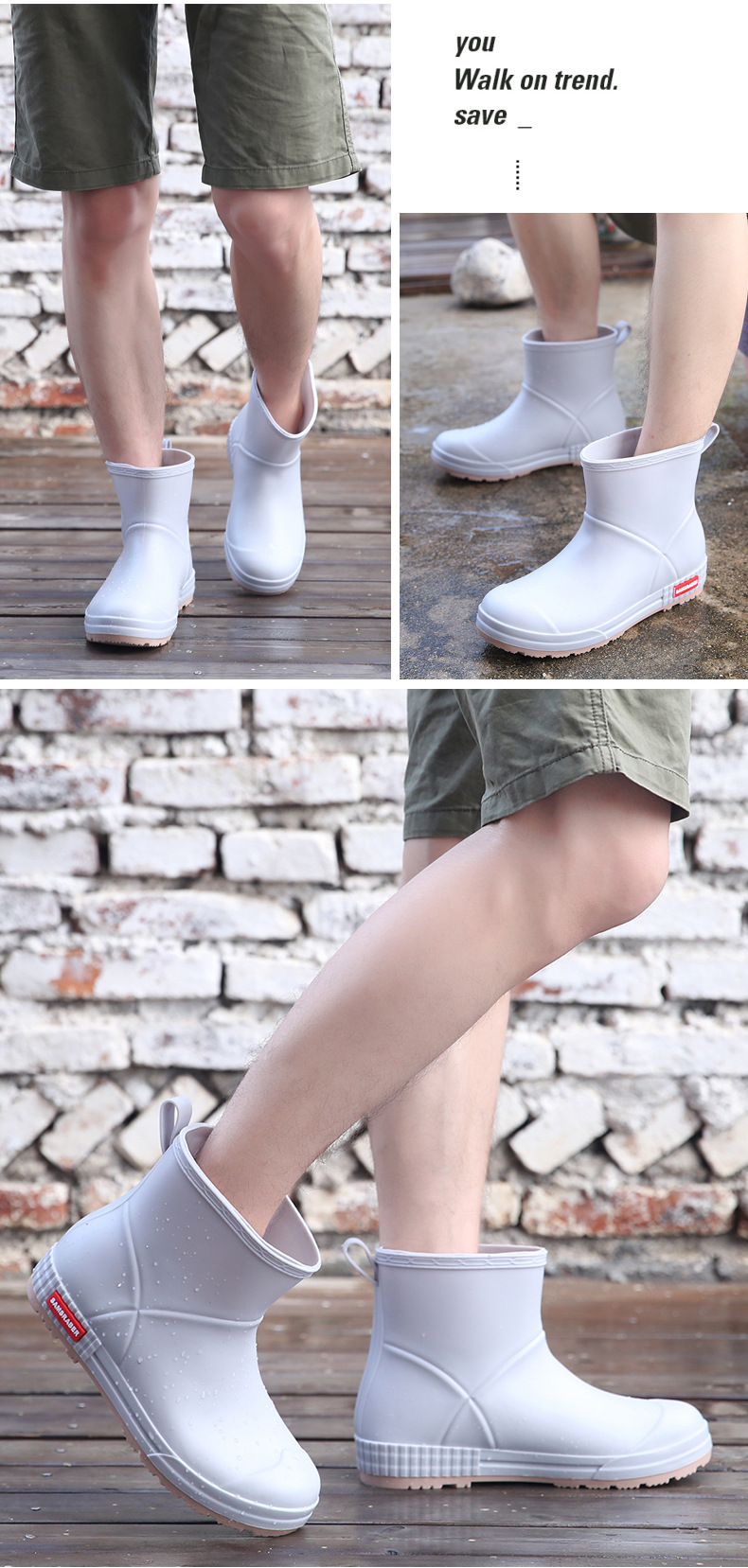 - ["Made of PVC upper and EVA outsole, breathable and anti-slip.","Waterproof and wear-resistant.","Mid-calf height.","Suitable for men and women.","Perfect for rainy days."]