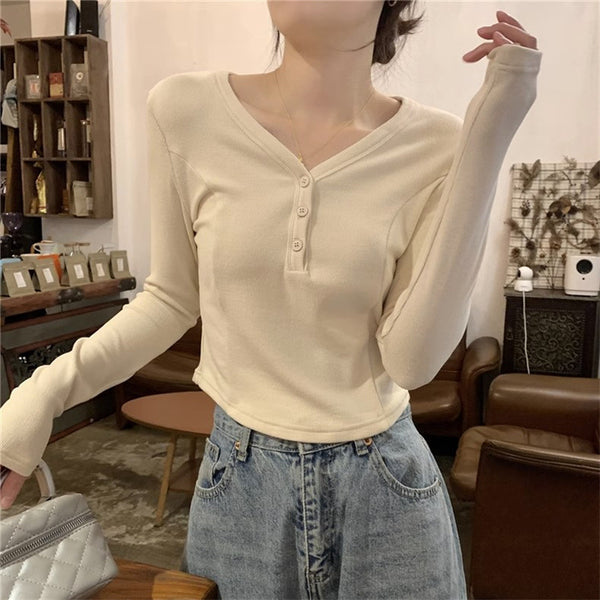 Camiseta de manga larga con cuello en V de fits de mujer con tela de poliéster 30%