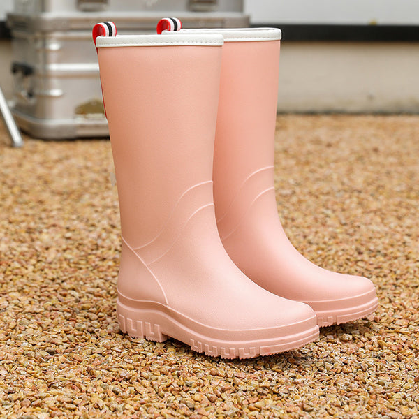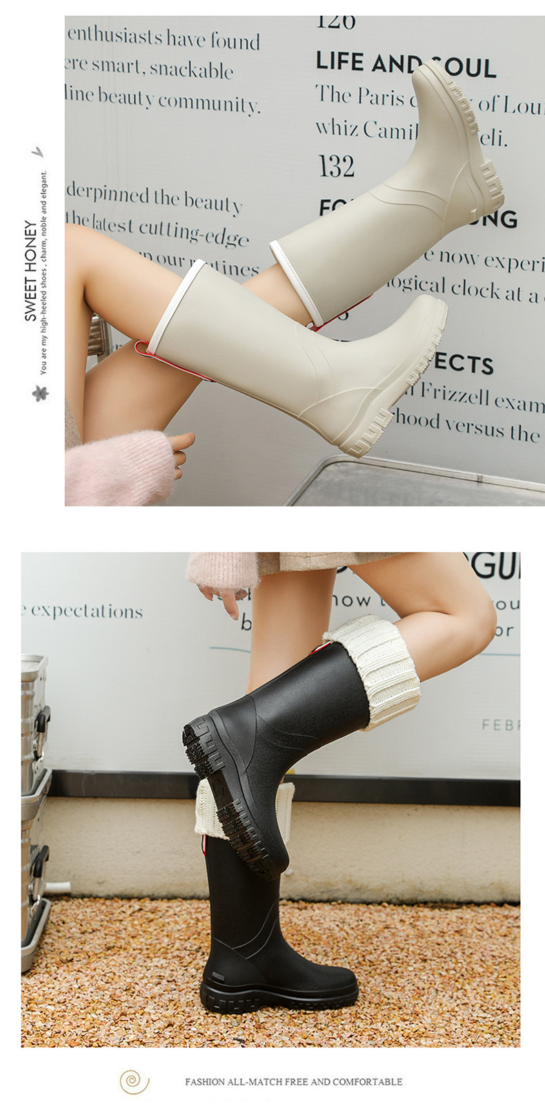 Botas de lluvia para mujeres de moda: material de PVC, tacón bajo, adecuado para todas las estaciones