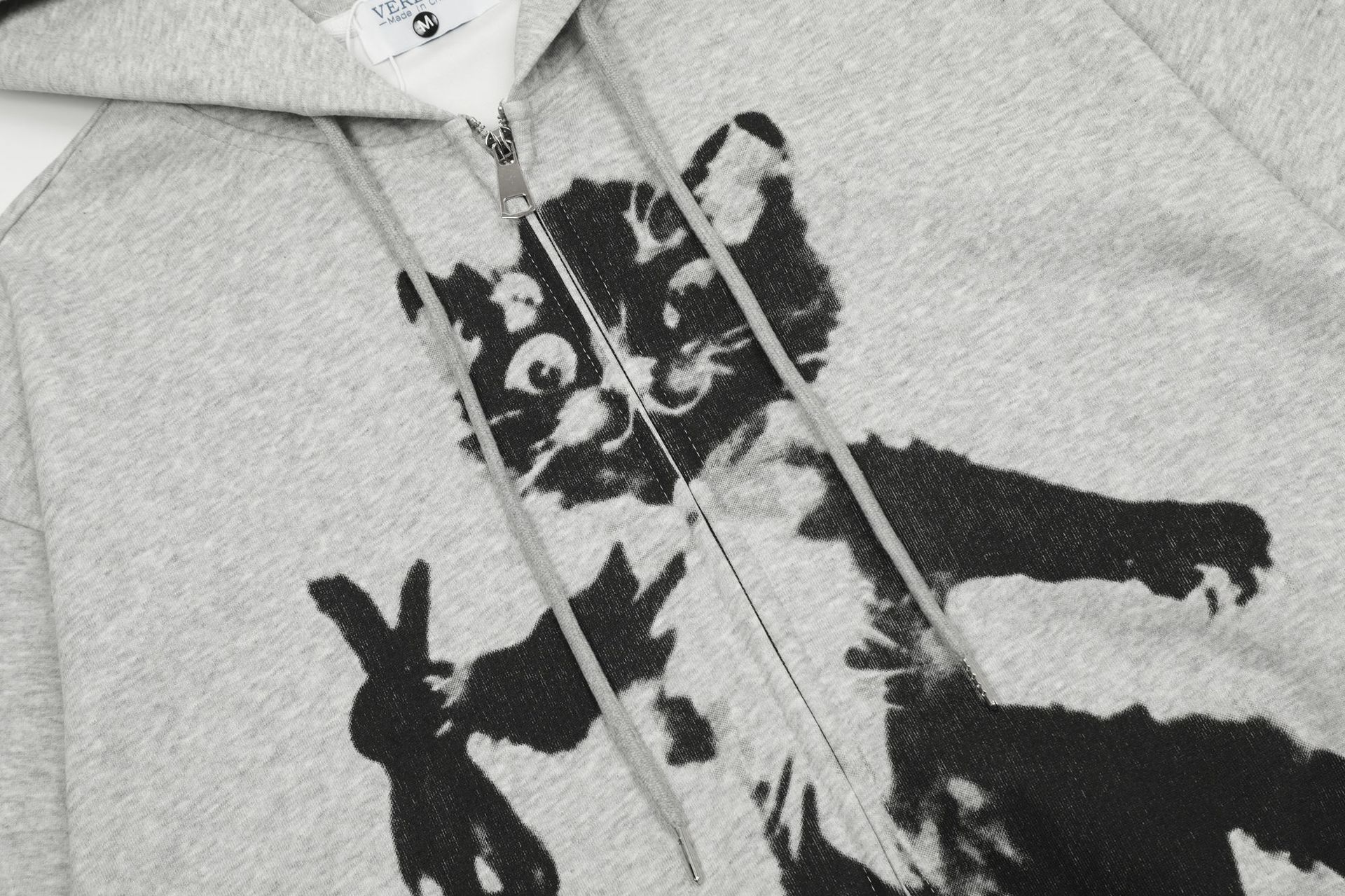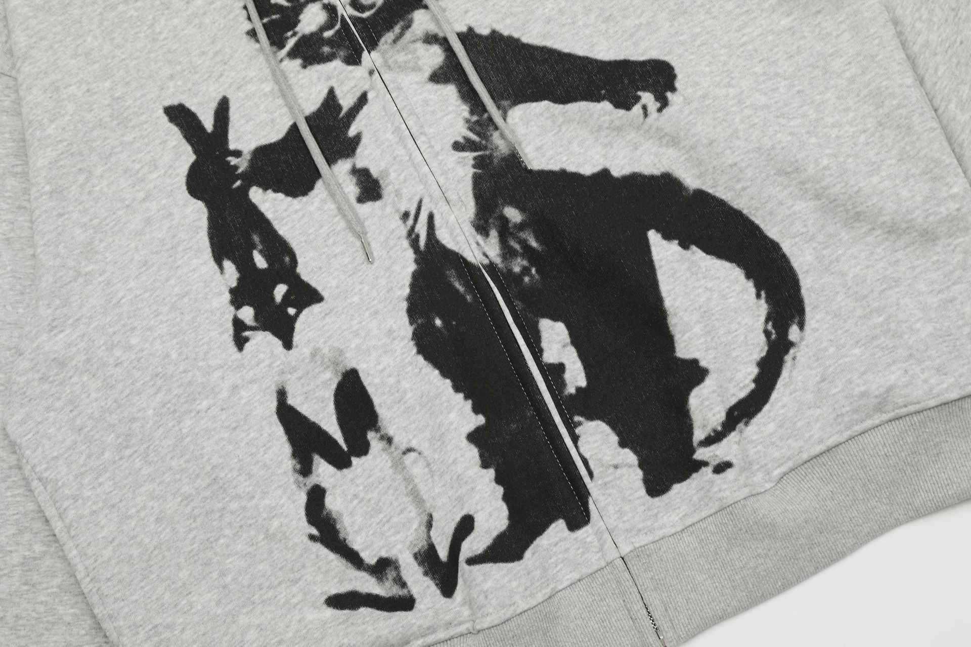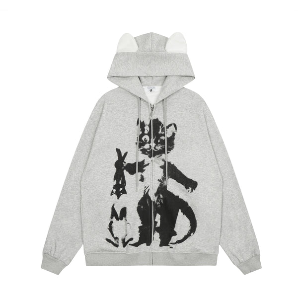 Jiayiku Men's 2024 New Autumn Winter Plus Velvet Hoodie Zipper Outerwear American Cartoon Cat Print Hoodie