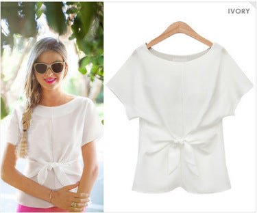Camisa de copo de nieve de estilo europeo de mujeres con cuello redondo, pajarita de mariposa y manga corta