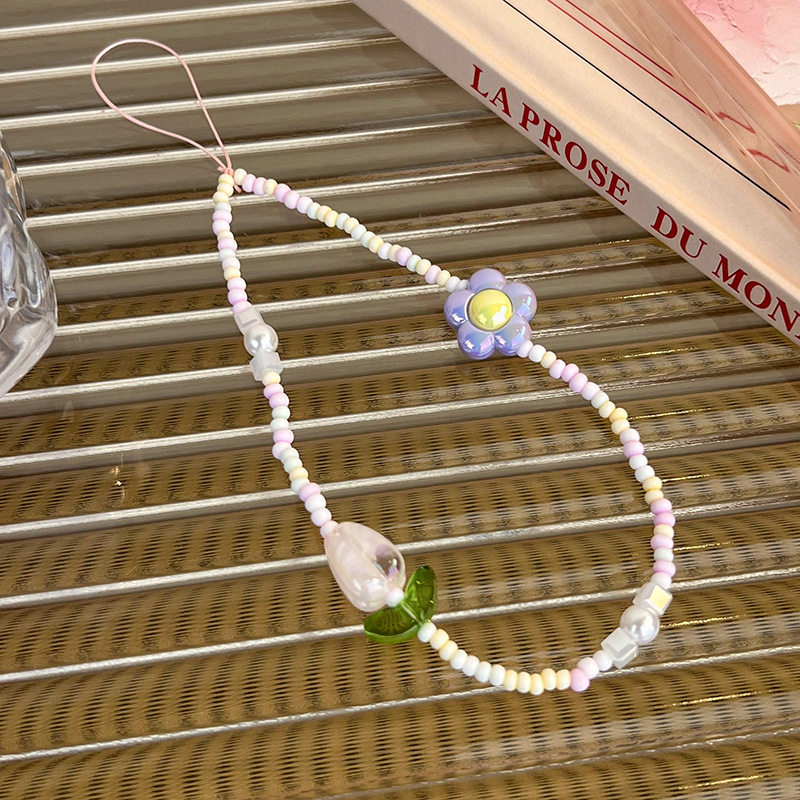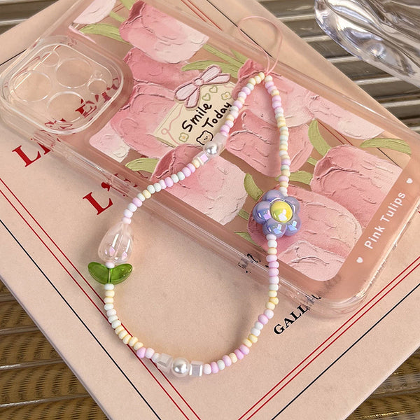 Cadena de teléfono de madera de árbol hecha a mano para mujer, con cuentas coloridas y decoración de flores