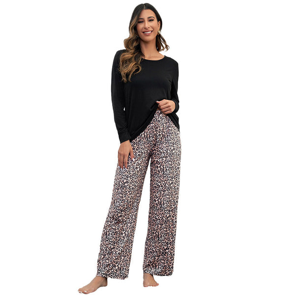 - ["Made from a soft and comfortable cotton blend material","V-neck top and leopard print pants set","Long sleeve and medium thickness for a comfortable fit","Perfect for casual home wear","4512120 - Women's Casual Home Outfit"]