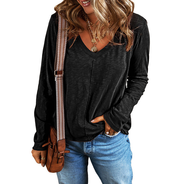 Tops de manga larga de cuello en V para mujeres, color liso liviano, ajuste suelto, 50 cm