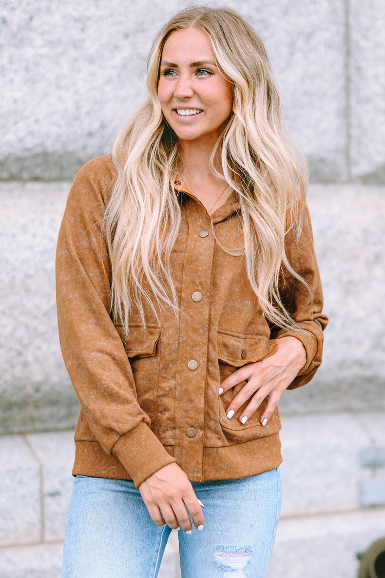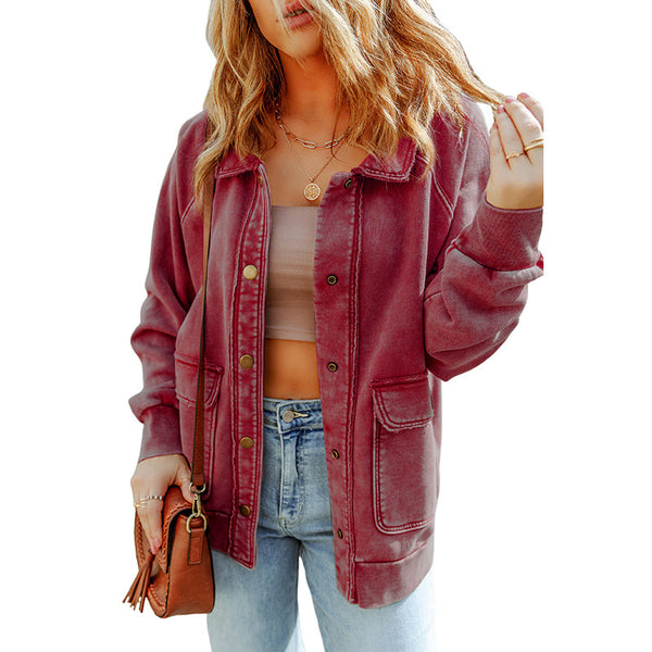 Chaqueta de mezclilla retro de lavado de mujeres con color puro, cuello cálido y giratorio, mangas largas