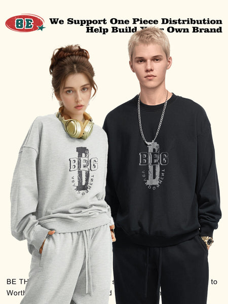 2024 Autumn American Campus Style Letter Customized Drop Shoulder Round Neck Loose Hoodless Sweater for Men