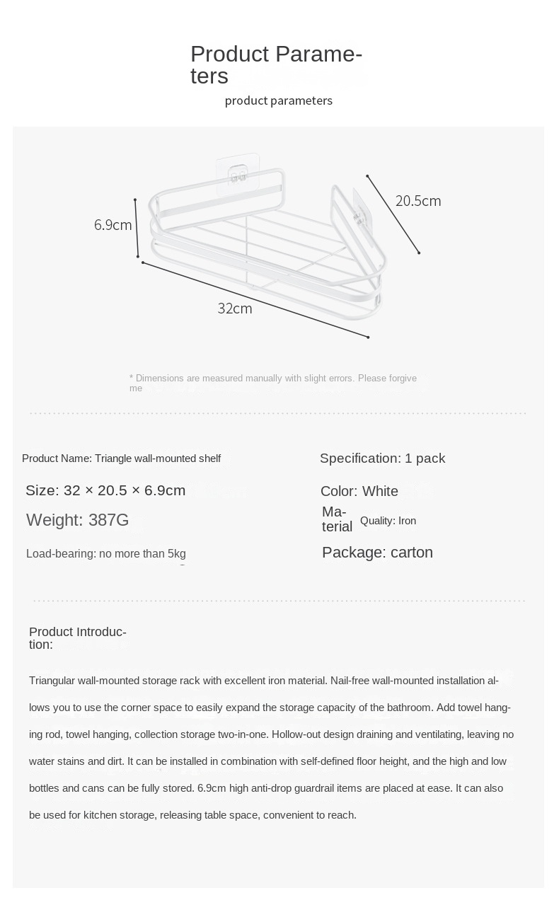 Modern Triangle Wall Mount Shelf with No Drilling, Iron Material, A0564-TA, 3kg Load Capacity, Single Layer