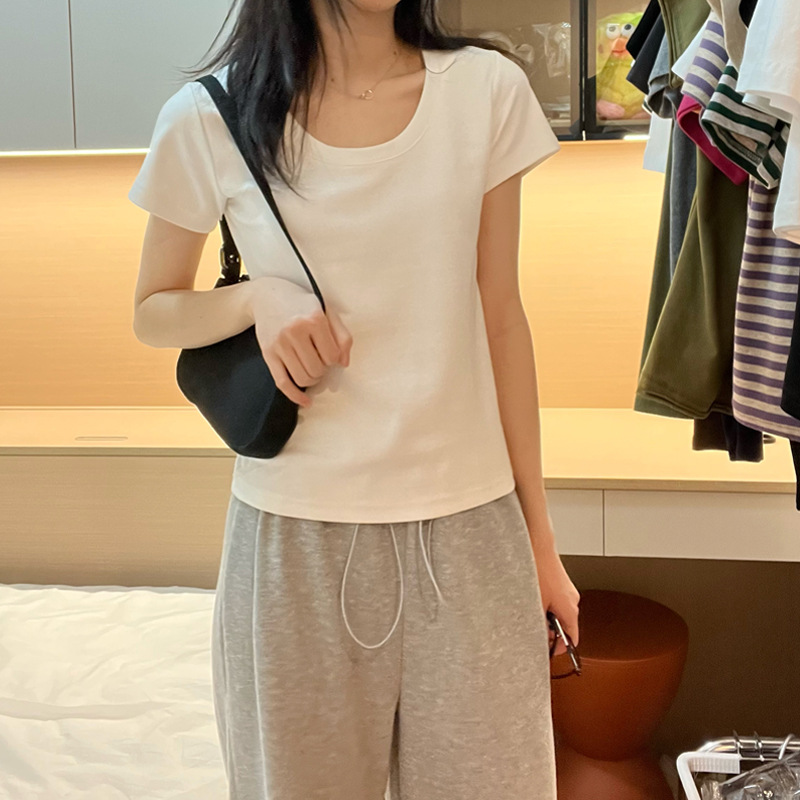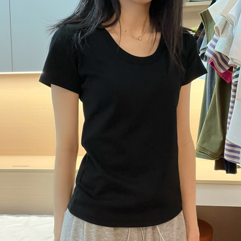 Women's U-Neck Grey T-Shirt - Classic Basic Style, Slim Fit, Short Sleeve