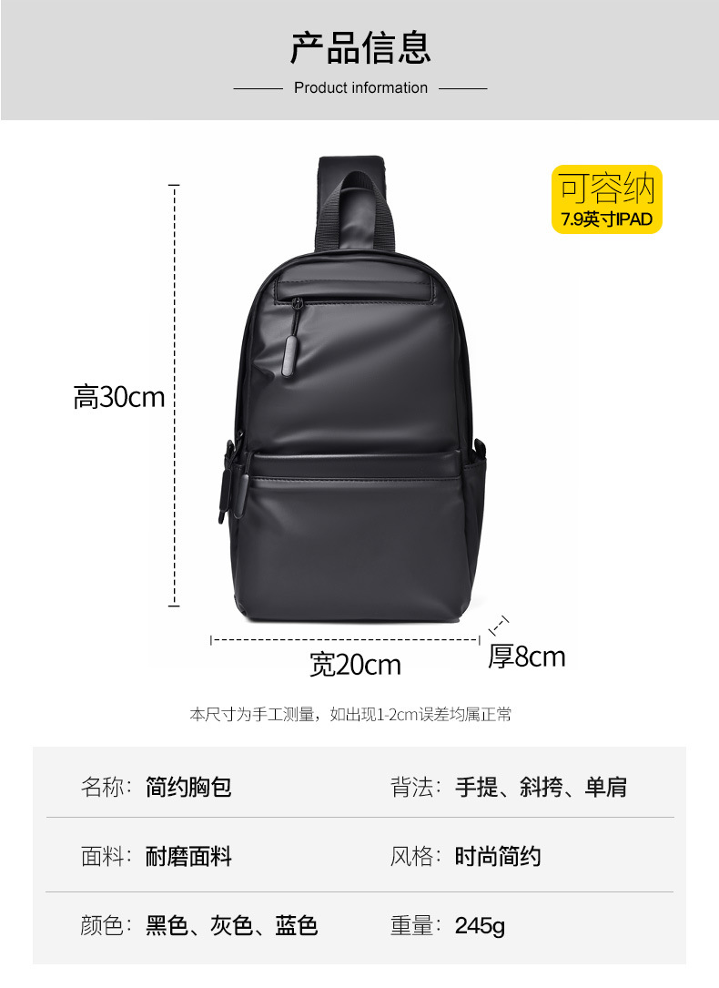 This men's chest bag is perfect for everyday use. It has a modern and stylish design with a multi-function shoulder bag. It is made of soft material and is lightweight and comfortable to wear. It is spacious enough to fit all your essentials and is perfect for any occasion. Get this stylish chest bag now and enjoy its convenience and style!