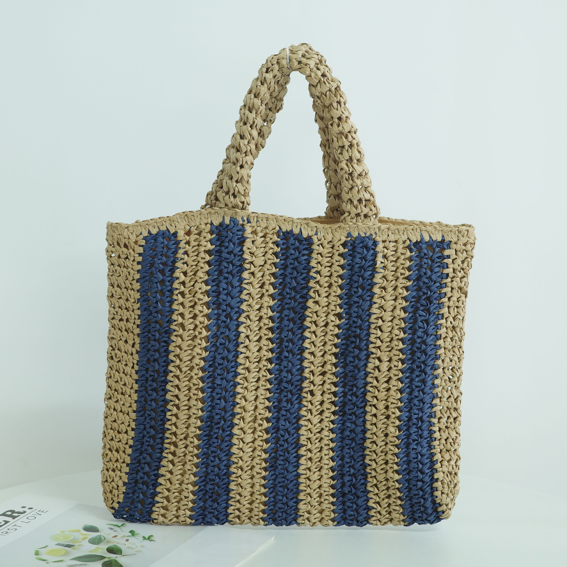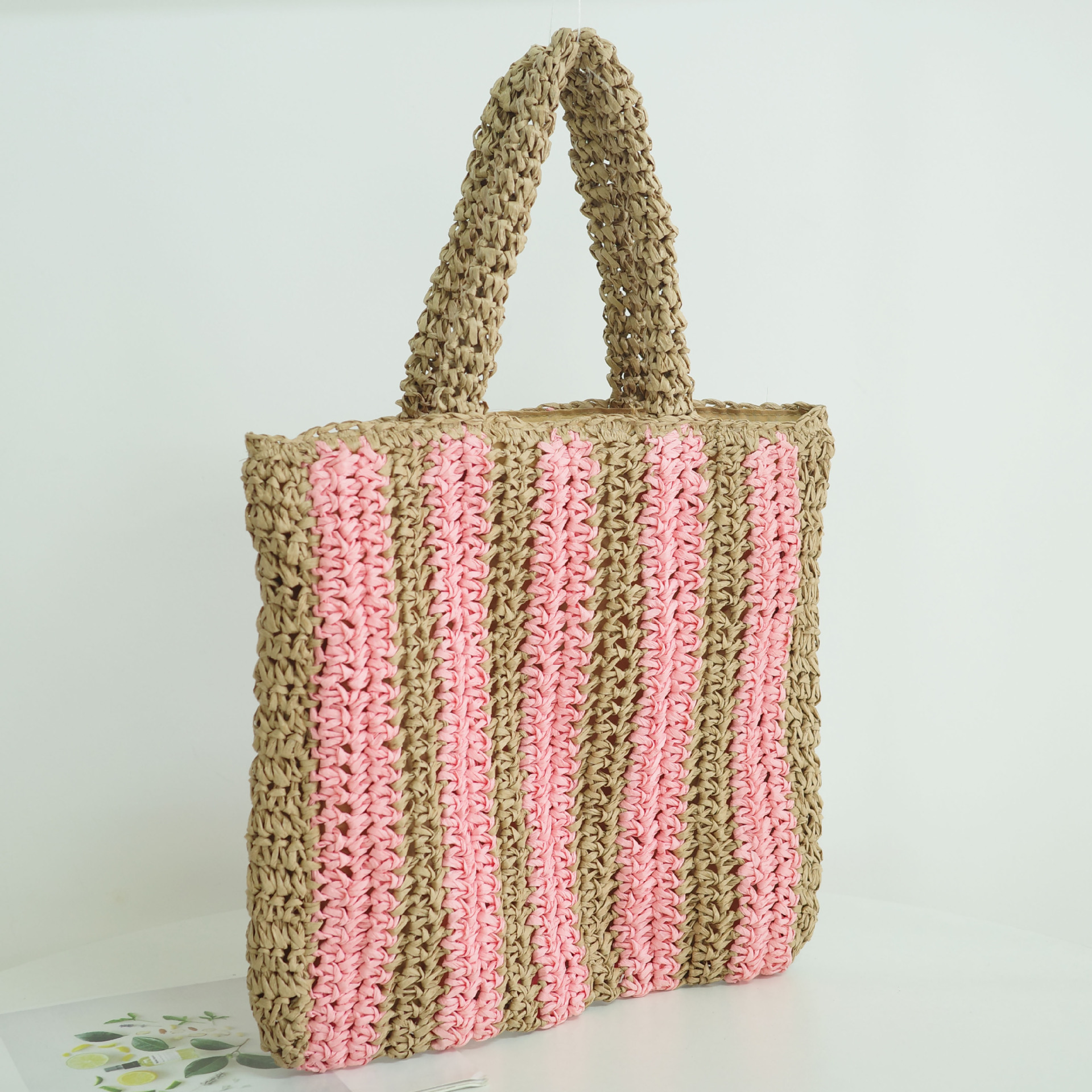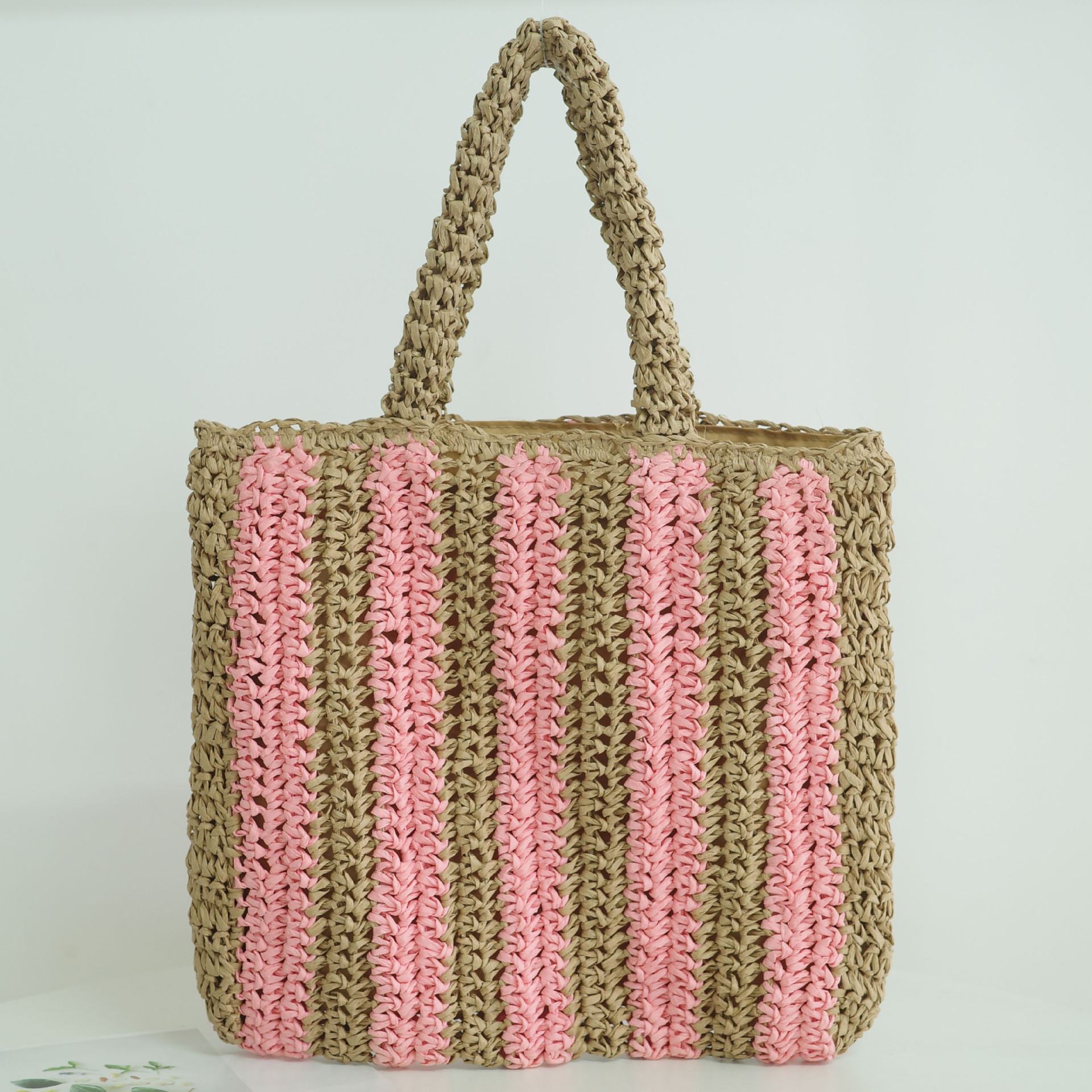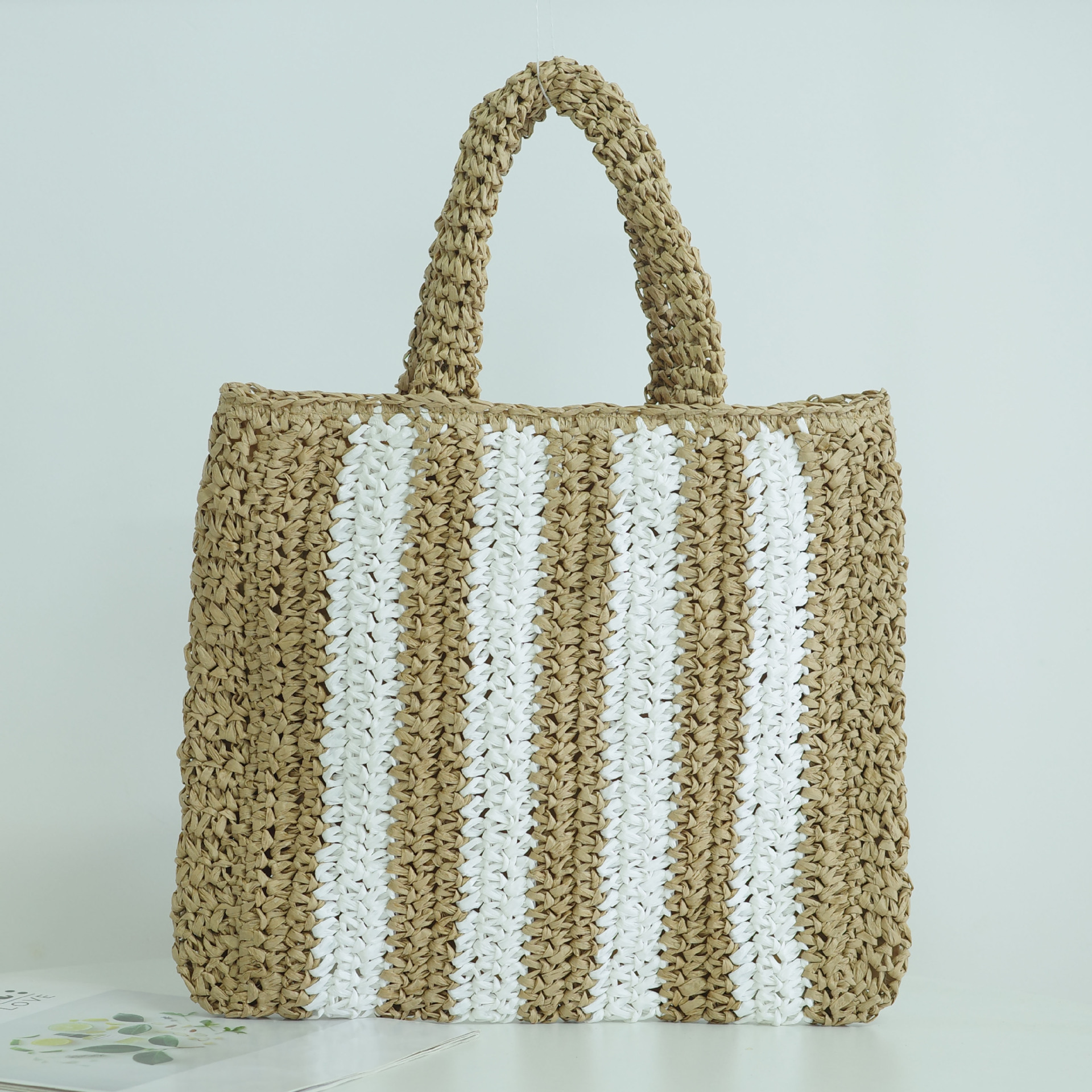 Women's Summer New Boho Style Beach Bag Shoulder Bag Vacation Bag with Hook Stitch Vertical Strip