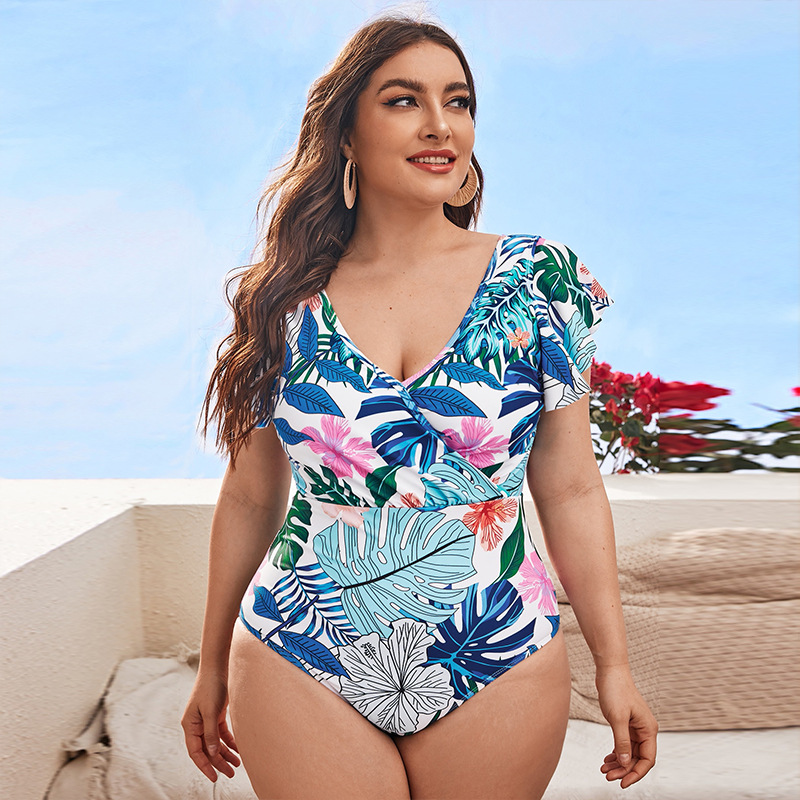 Plus Size Mature Lady Swimsuit with Floral Print and Shoulder Sleeves