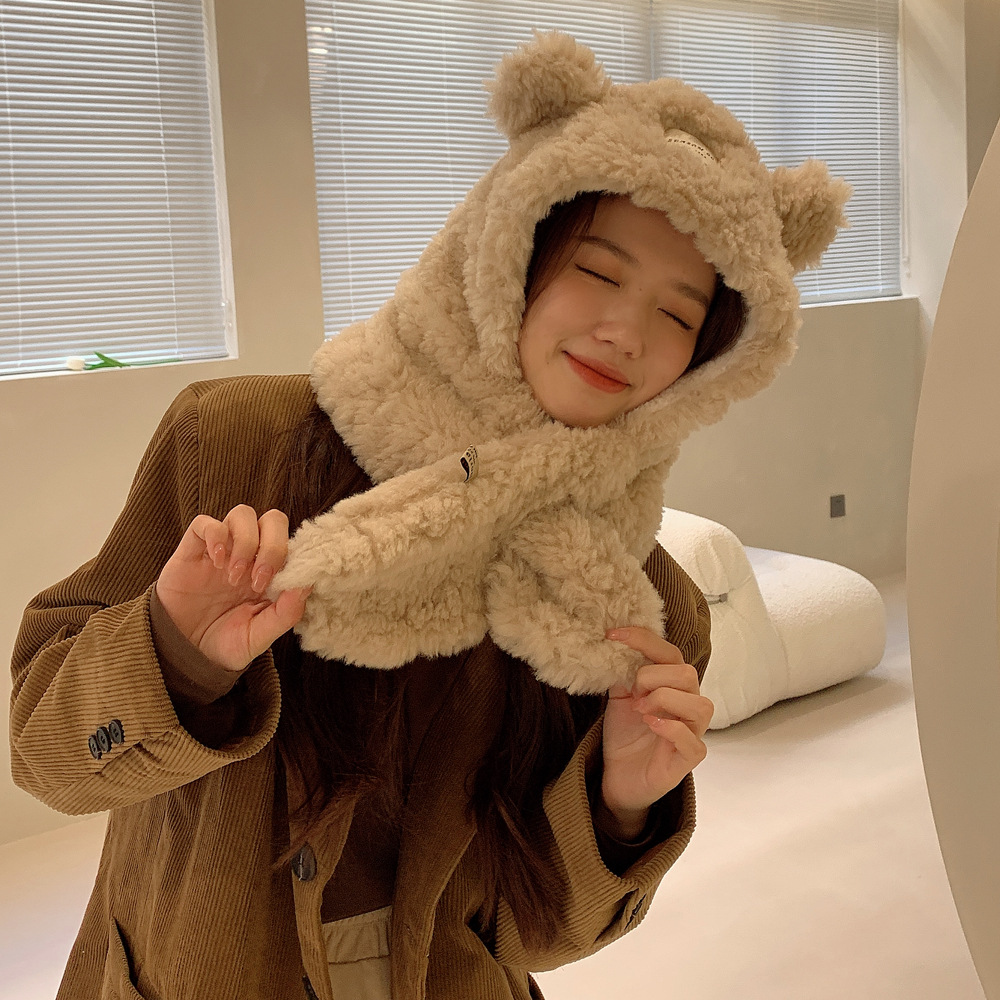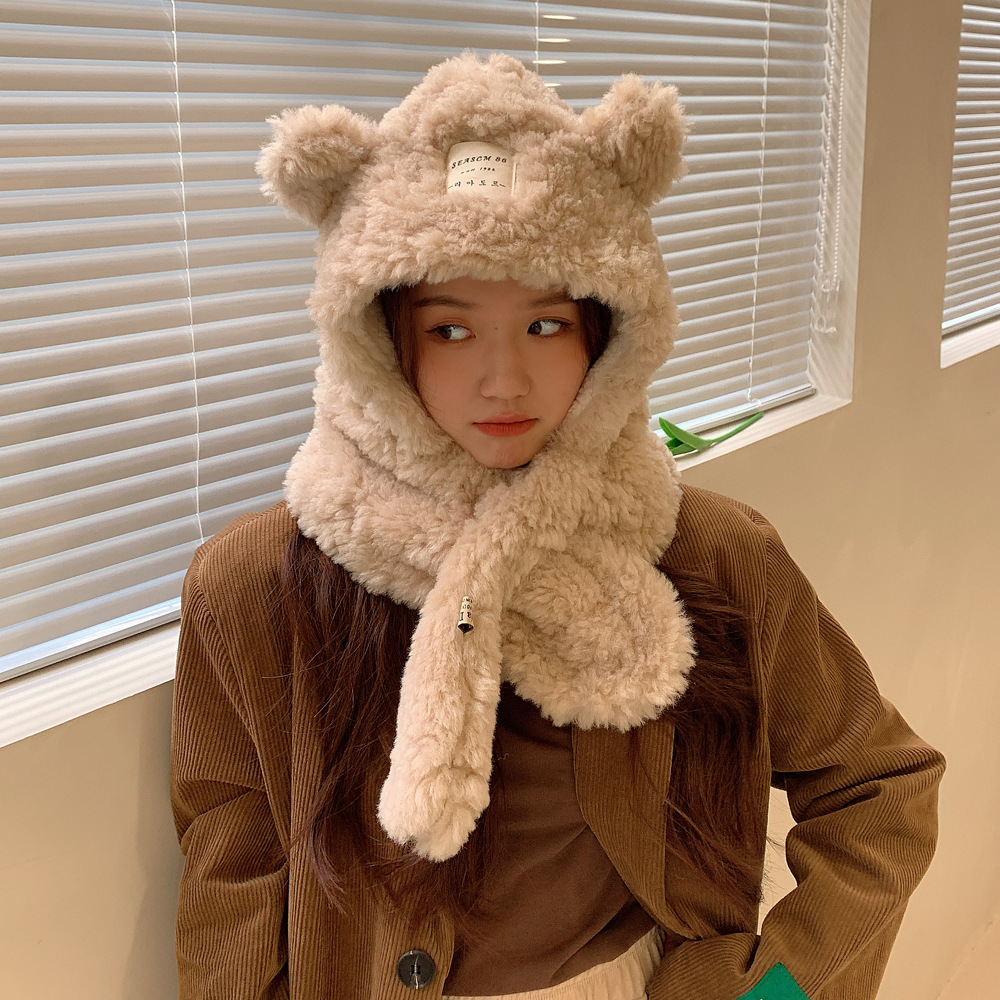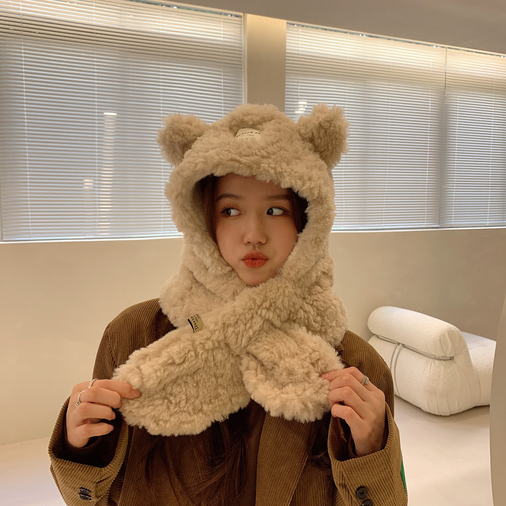 Women's Cute Bear Ears Scarf Hat, High Quality, Keep Warm, Thick Plush, Hooded Scarf, Winter Season