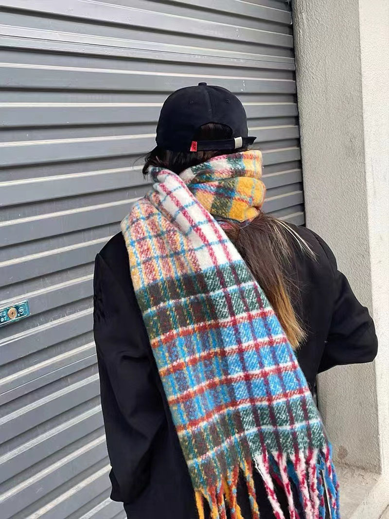 Autumn-Winter Rainbow Plaid Faux Fur Scarf for Women
