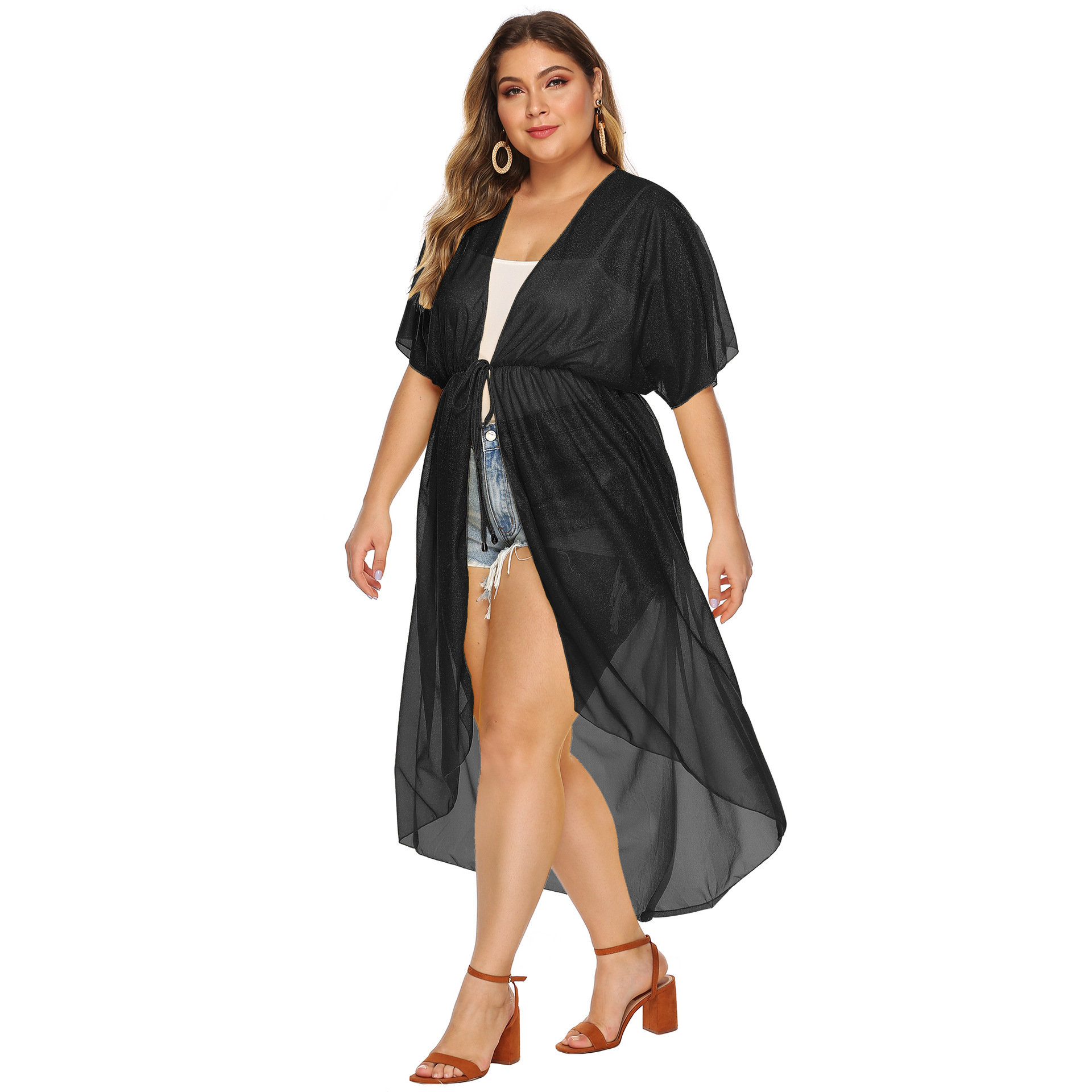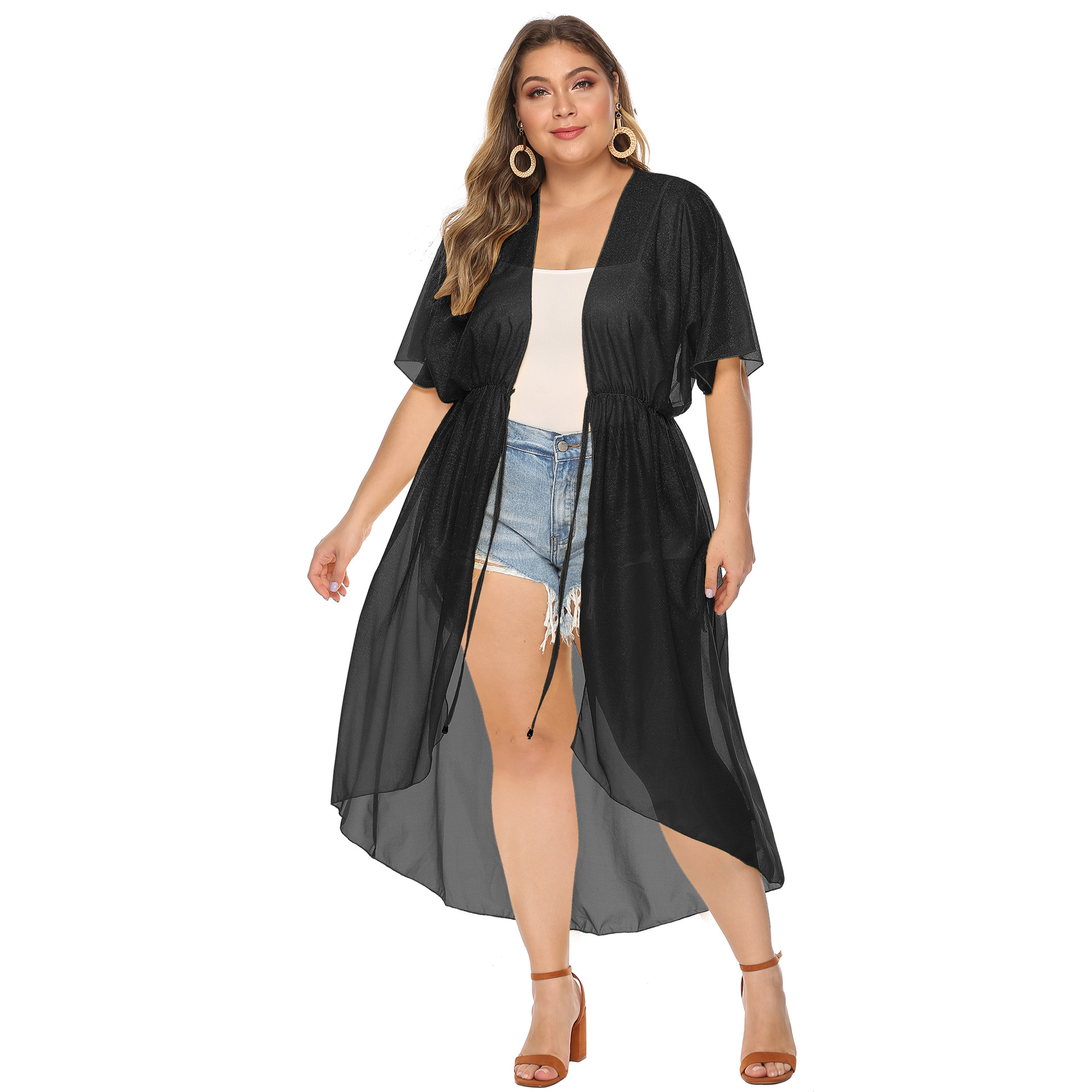 - ["Made of snowflake material for comfortable wearing","Features a belt waist for a slim look","Irregular open kimono style for a fashion look","Loose fit for a relaxed feel","Perfect for beach days and casual occasions"]