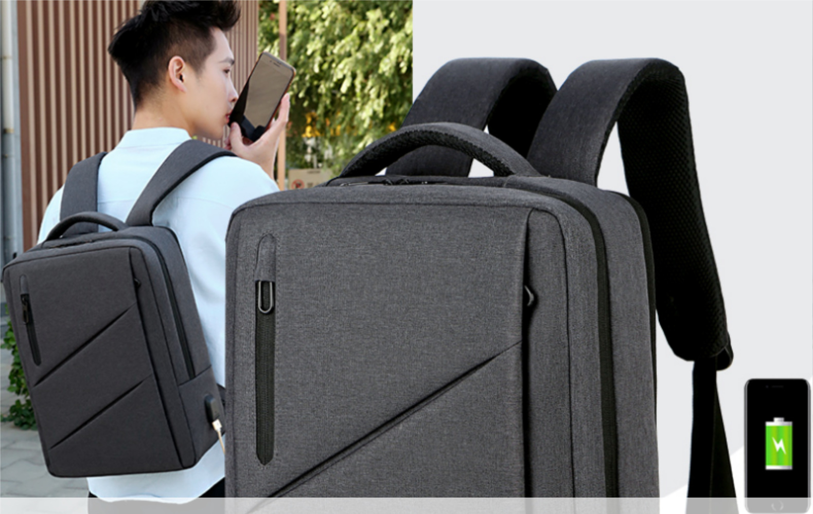 - ["Large capacity of 36-55L for storing your laptop, phone, documents and more","USB charging port for convenient charging","Waterproof design to protect your items from water","Double shoulder straps for comfortable carrying","Ideal for business trips, daily use and promotional events"]