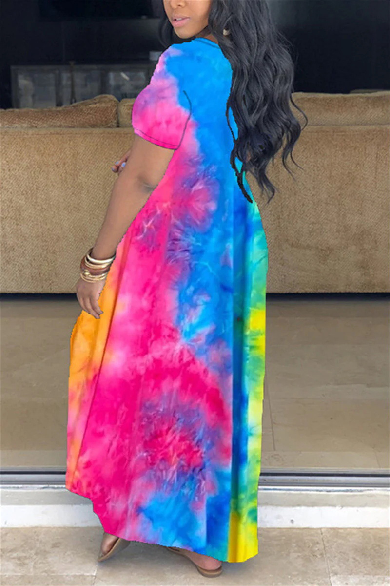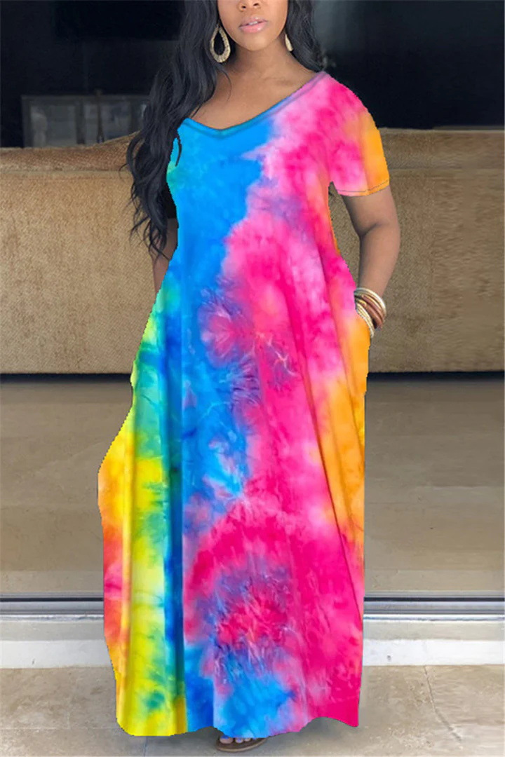Fashionable Plus Size Long Sleeve V Neck Tie-Dye Dress