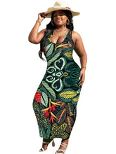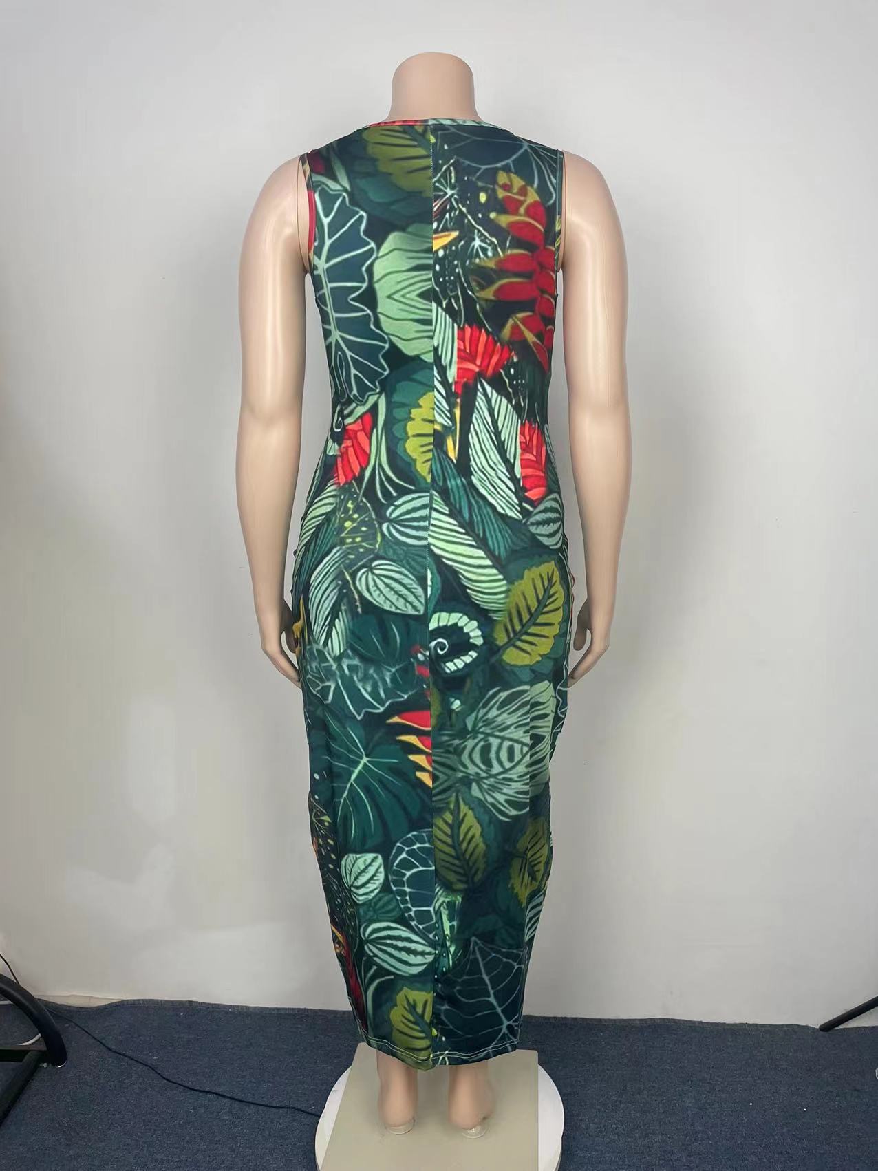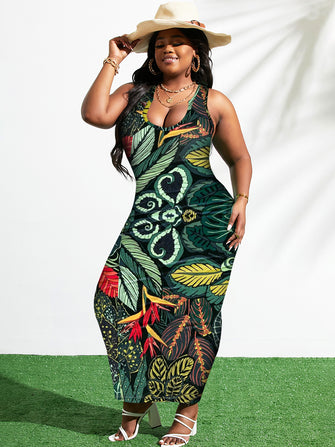 Stylish Floral Leaf Print U-Neck Sleeveless High Waist Plus Size Dress from Guangzhou