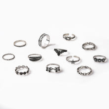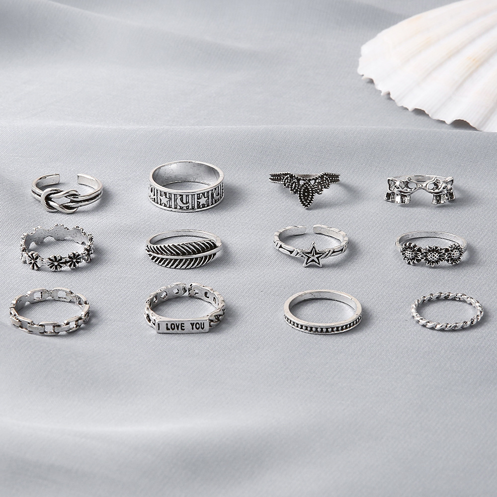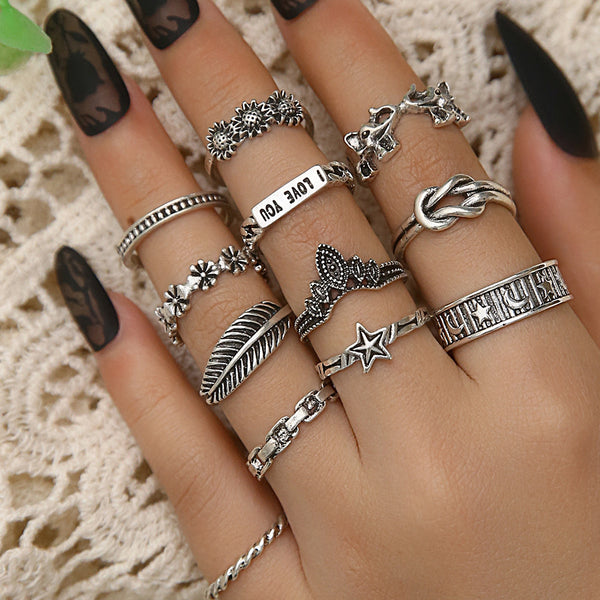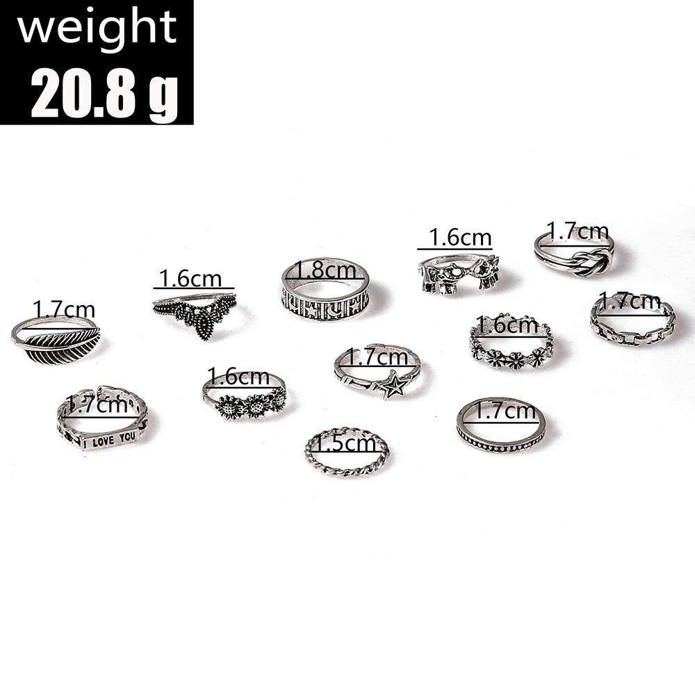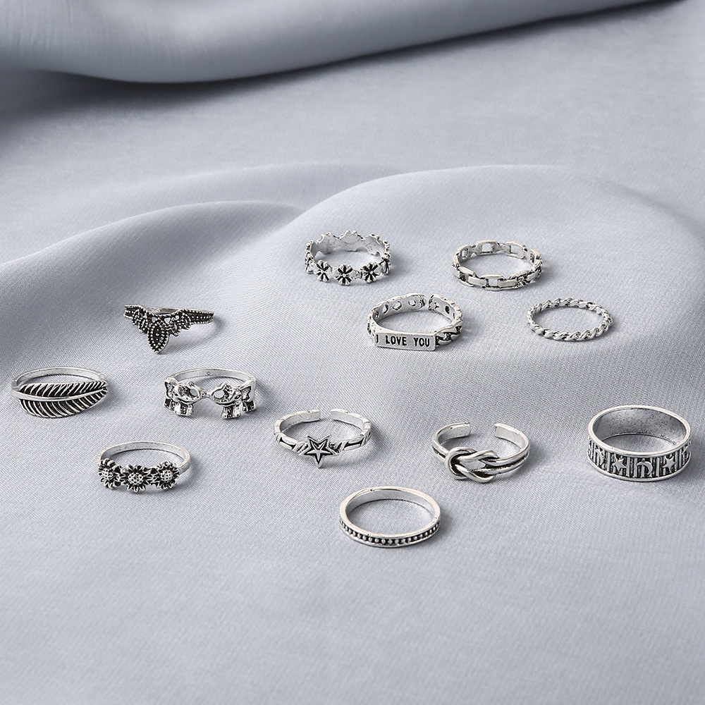 12-Piece Leafy Elephant Adjustable Ring Set with Metal, European-American Style, Jewelry Craftsmanship and Gift-Giving Occasions