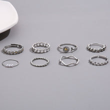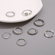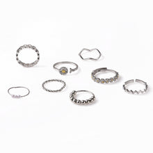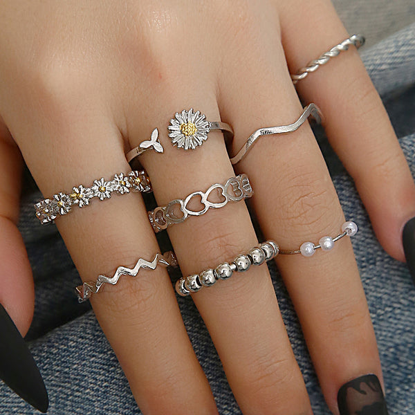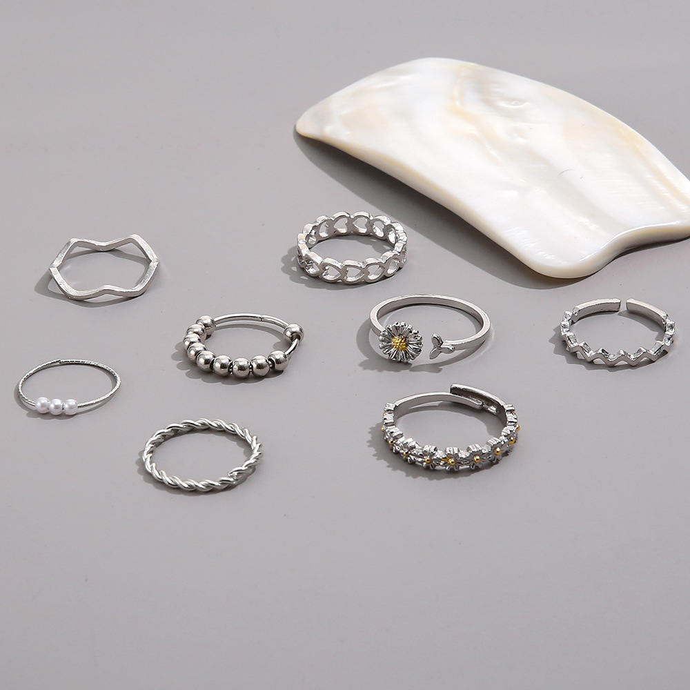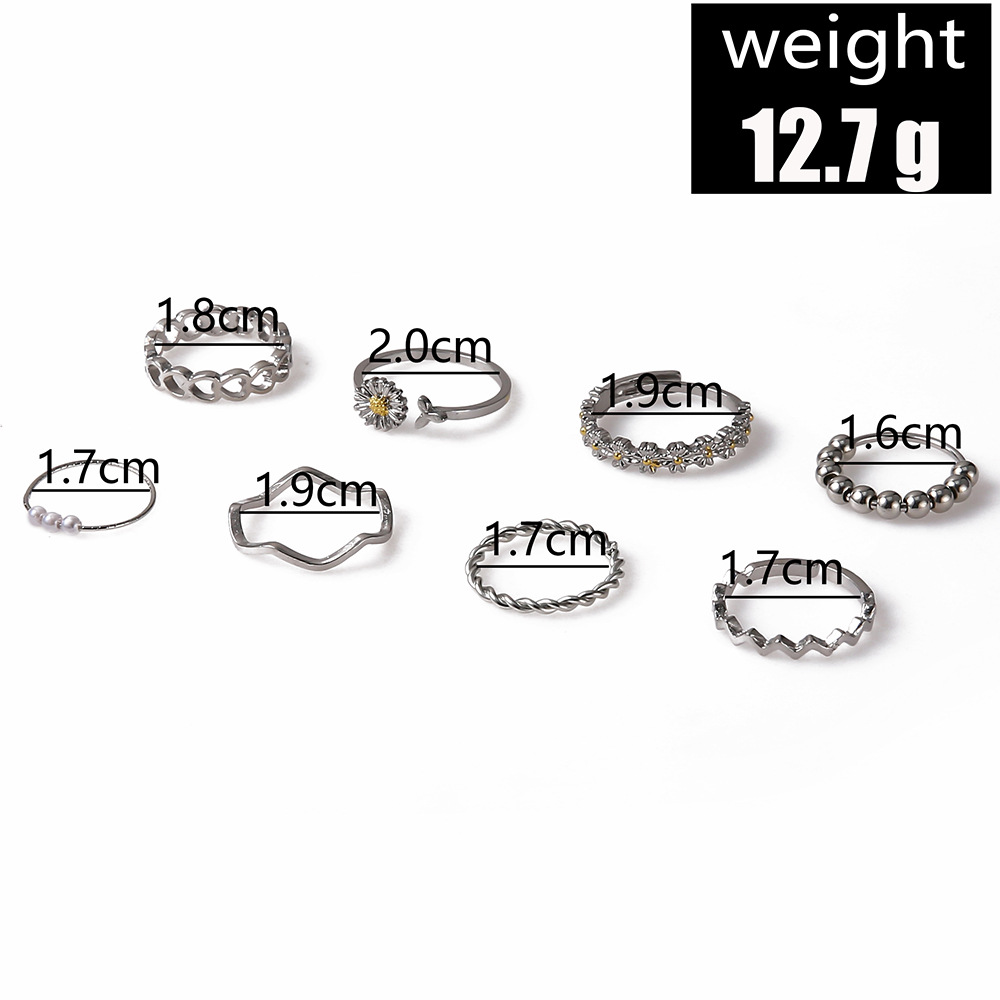 Korean Style 8 Pieces Flower Rings Set with Alloy and Half Beads Stones for Women