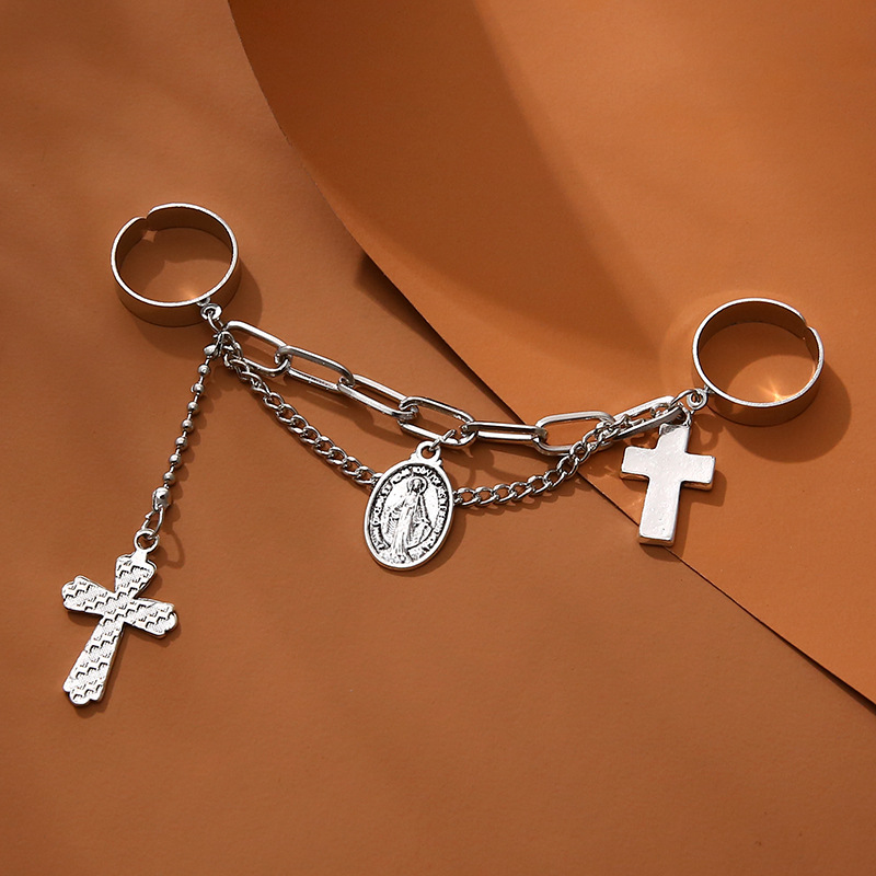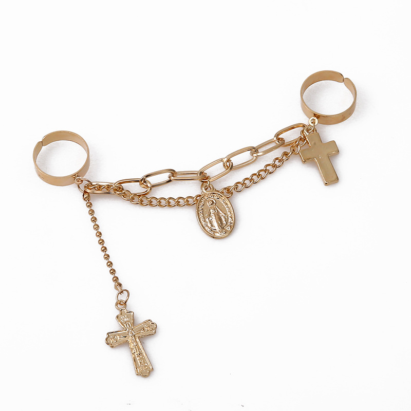 Adjustable Virgin Mary Cross Ring with Chain and Ring Finger, 10K Gold Plated