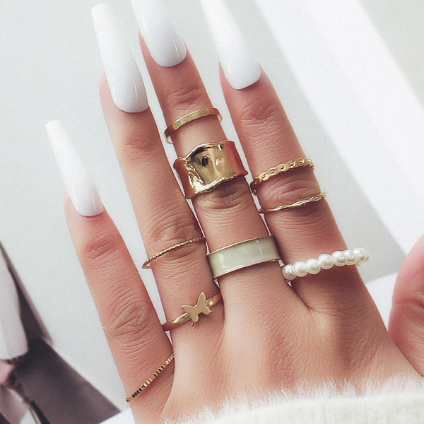 Fashion 9 Pieces Butterfly Rings Set with Gold Alloy and Beads for Women