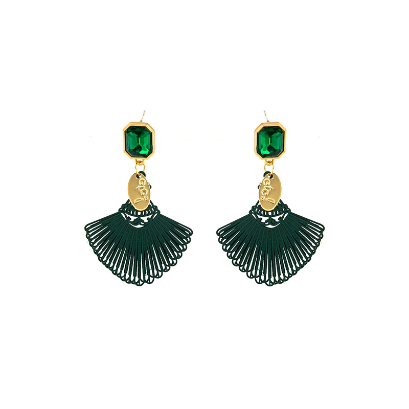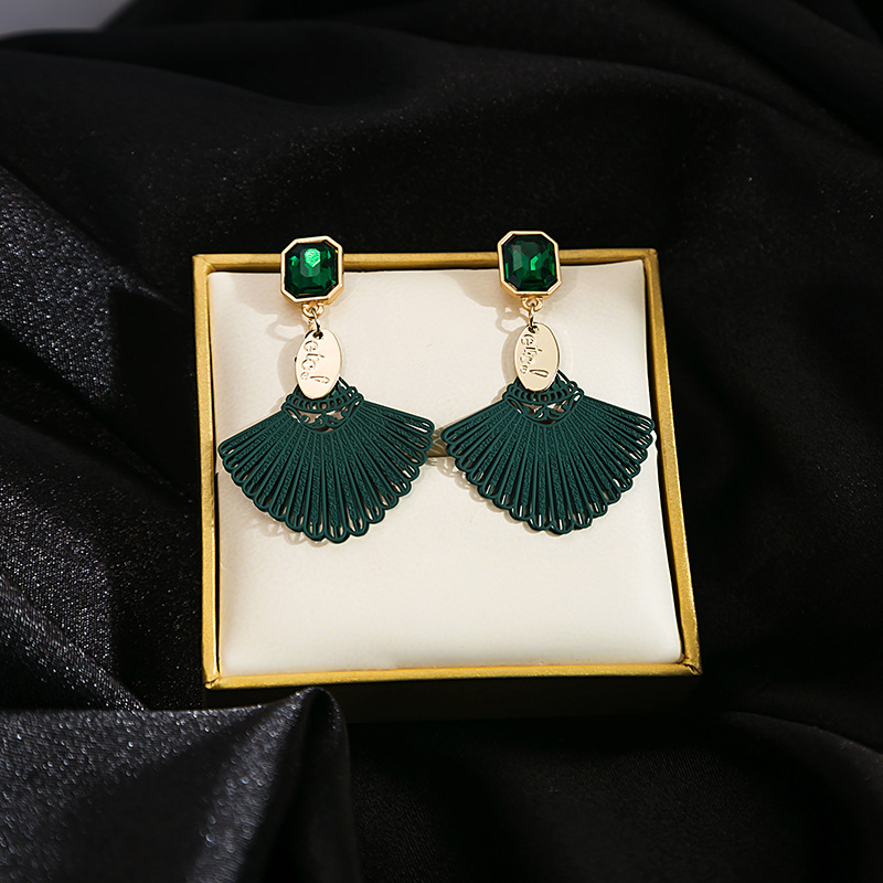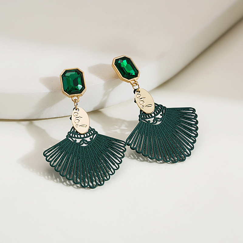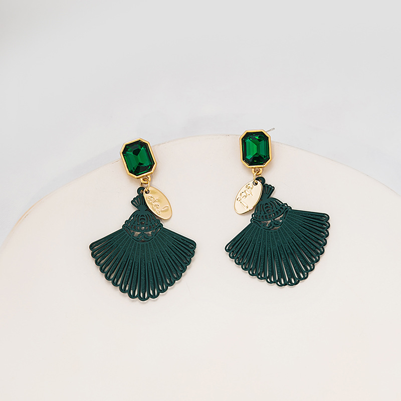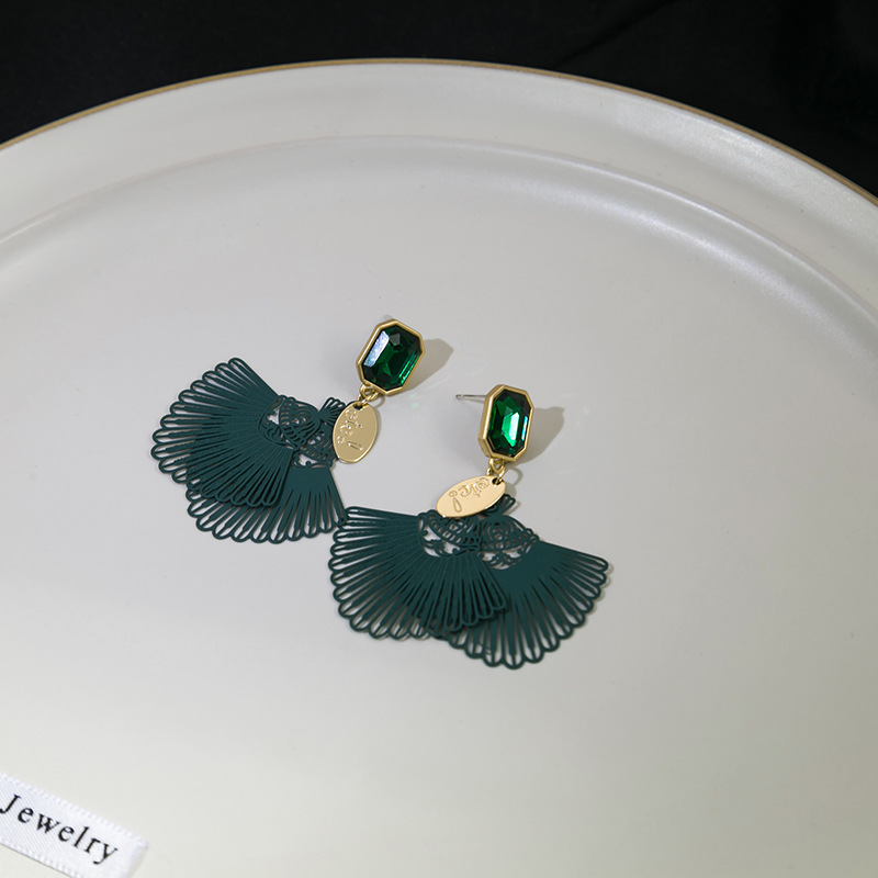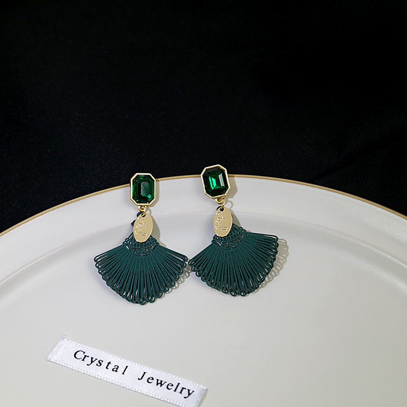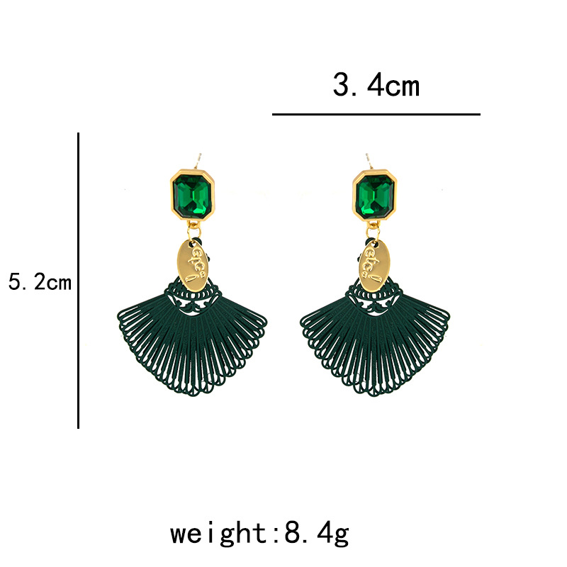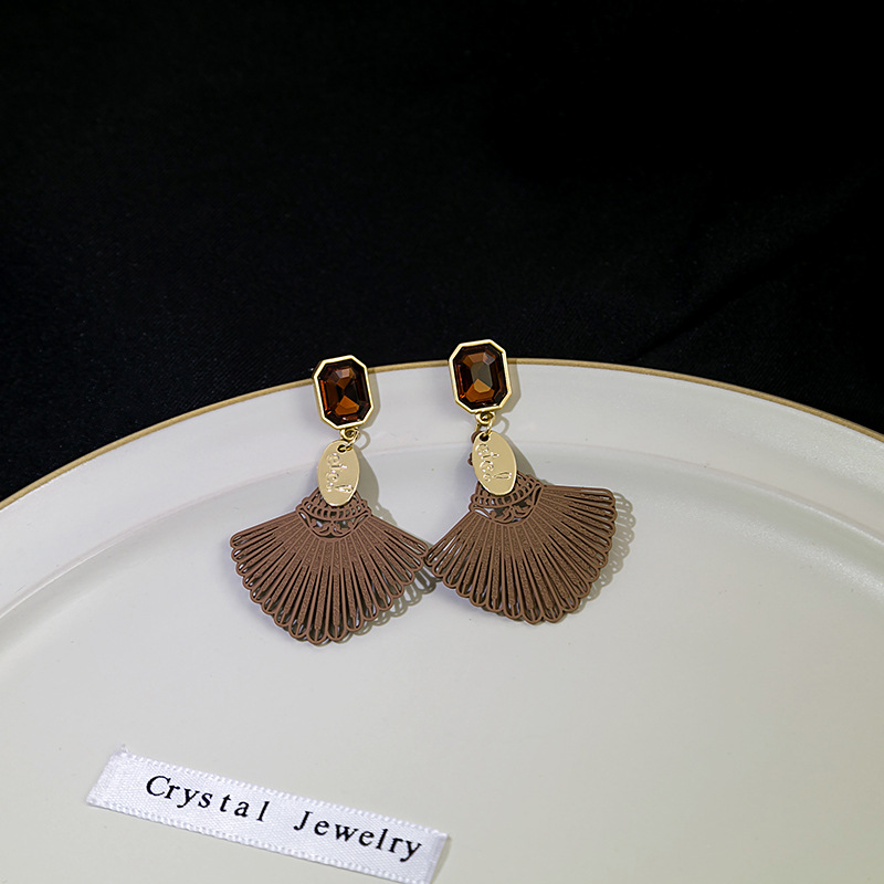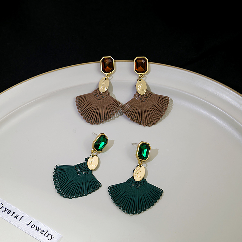 Silver Retro Fan-Shaped Crystal Earrings with Geometric Hollow Design