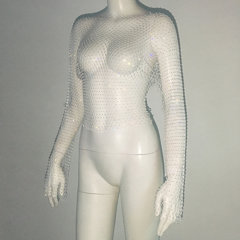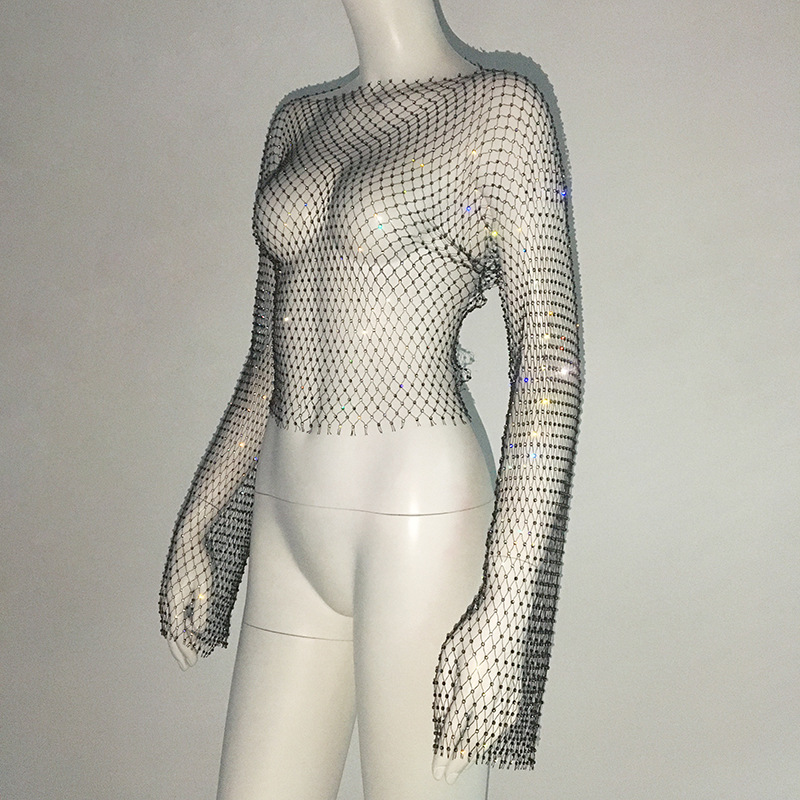 Fashionable Sparkling Fishnet Long Sleeve Slim Fit Blouse for Stylish Party Girls