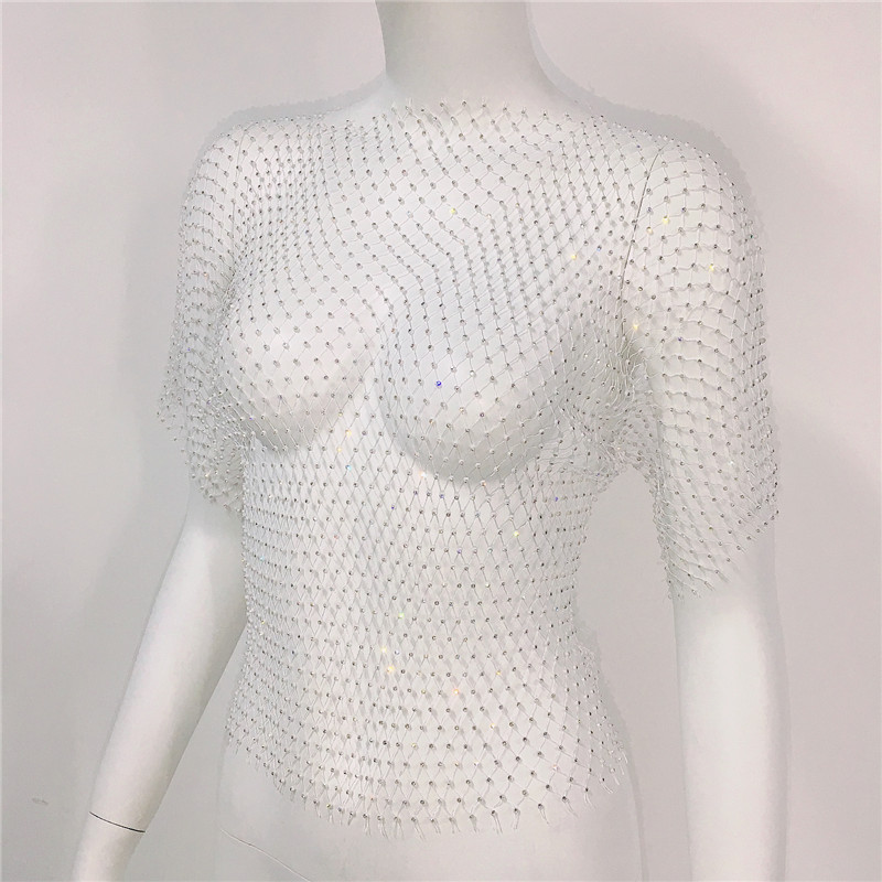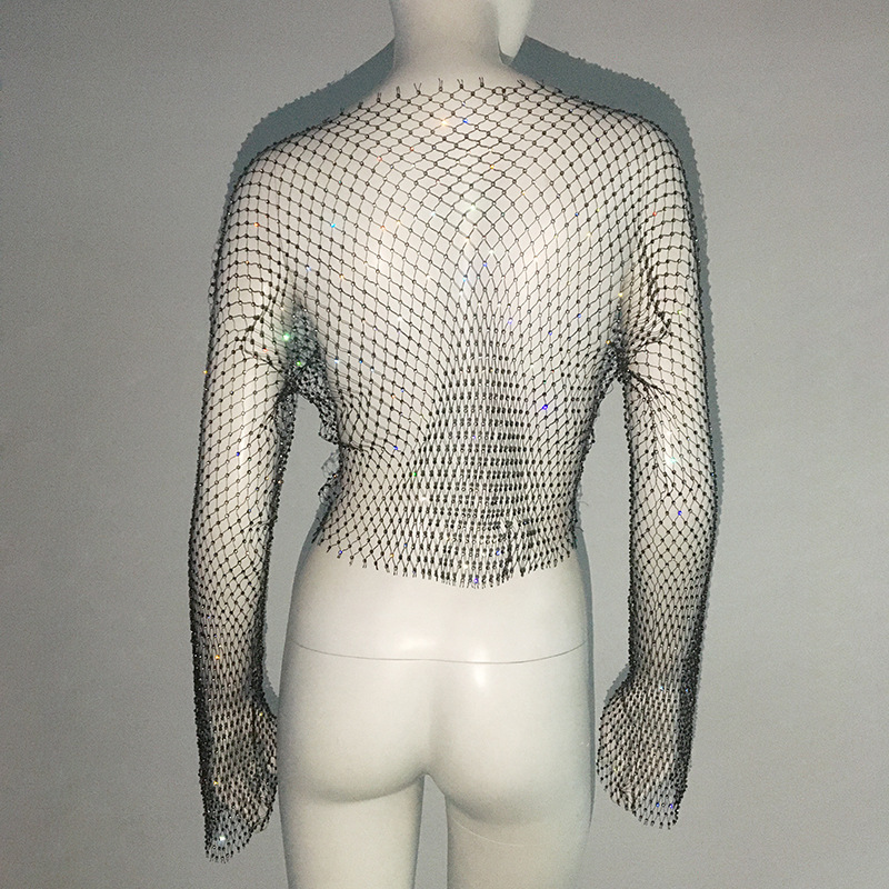 {"Cut":"Slim Fit","Style":"Fashionable Lady","Length":"Short (40cm < Length ≤ 50cm)","Pattern":"Mesh","Style Type":"Private Name Celebrity","Collar Type":"Mandarin Collar","Fabric Name":"Eco-friendly Yarn Glass","Sleeve Type":"Bell Sleeve","Craftsmanship":"Hand-woven","Sleeve Length":"Long Sleeve","Fashion Element":"Fishnet with Rhinestones","Cross-border Style Type":"Sexy and Hot Girl","Main Fabric Component 2":"Glass","Main Fabric Composition":"Eco-Friendly Yarn","Main Fabric Component 2 Content":"30% or below","Main Fabric Composition Content":"50% (Excluding) - 70% (Including)"}