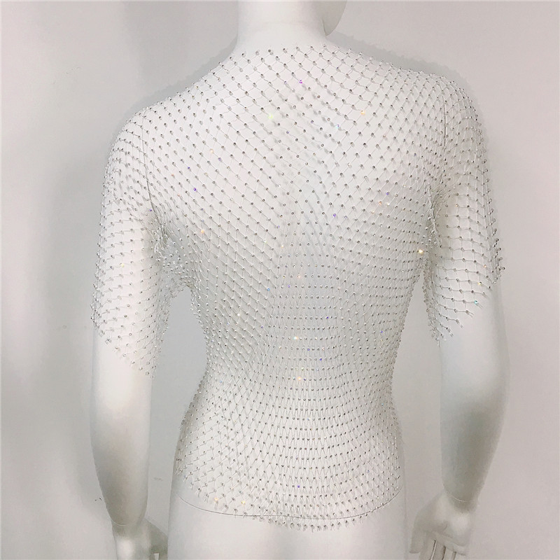 - ["Made with polyester and spandex for a comfortable fit","Slim fit and long sleeve for a fashionable look","Crew neck and sparkling fishnet for a stylish look","Available in multiple sizes to fit your body shape","Perfect for stylish parties and events"]
