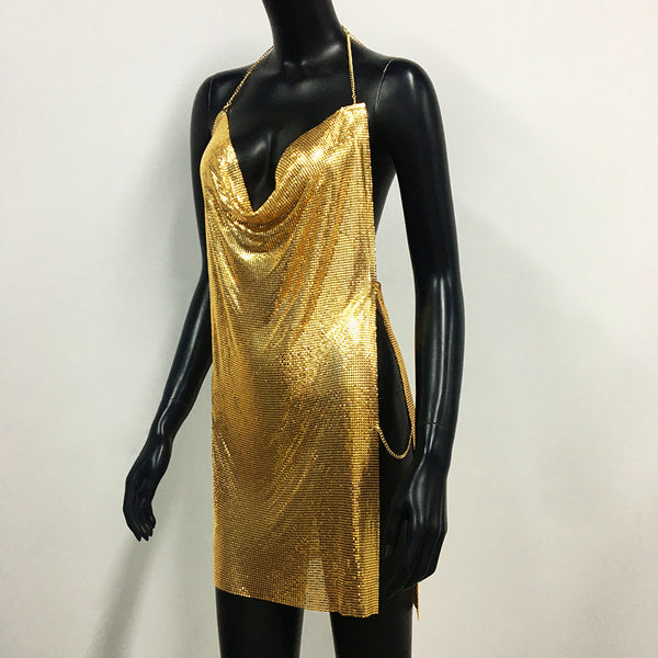 - ["Made of 95% metal blend, this dress is perfect for special occasions","V-neck and sleeveless design makes it sexy and fashionable","Low waist design is perfect for showing your figure","The gold metallic mesh fabric is perfect for a night out","The blend of metal and fabric make it comfortable to wear"]