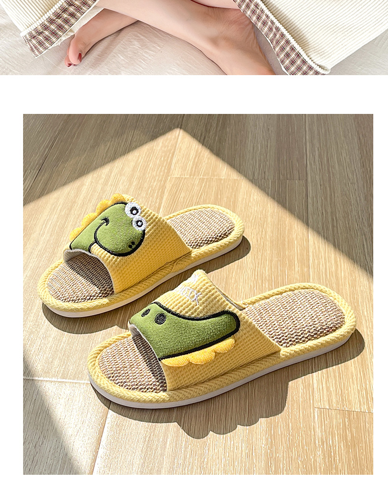 {"Style":"Cartoon","Function":"Breathable, Slip-resistant, Sweat-absorbent","Age Range":"Adults","Thickness":"Regular Thickness","With Heel":"No","Slippers Type":"Thong Slippers","Sole Material":"PVC","Sole Thickness":"1.5cm (inclusive) - 3.5cm (exclusive)","Upper Material":"Linen","Fashion Element":"Dinosaurs","Suitable Season":"Summer, Winter, Spring, Autumn","Does it have USB":"No","Midsole Material":"EVA Midsole (One-Time Foaming)","Sole Craftsmanship":"Stitched Shoes","Gender Applicability":"Unisex/Suitable for Both Men and Women","Latest Delivery Time":"8-15 Days","Applicable Crowd Type":"Couples","Fastest Shipping Time":"1","Quality Inspection Report":"No","Season of Launch (Launch Time)":"Spring 2022"}