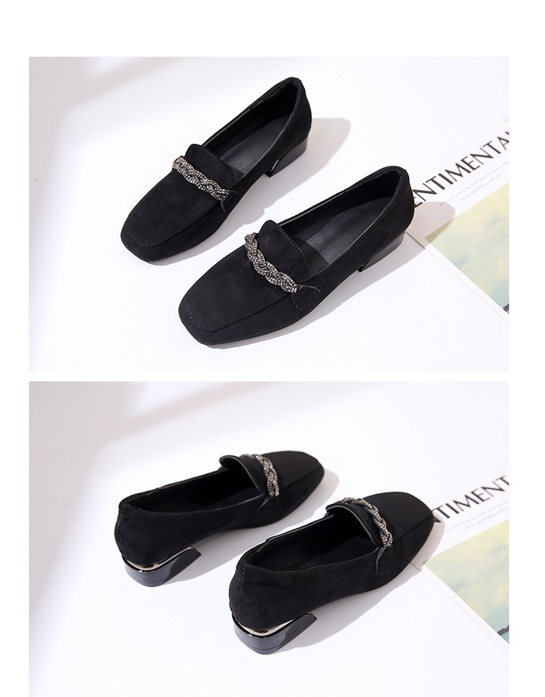 Fashion Korean Women Shoes with Water Diamond Chain, Square Head, Corduroy Surface and Low Heel