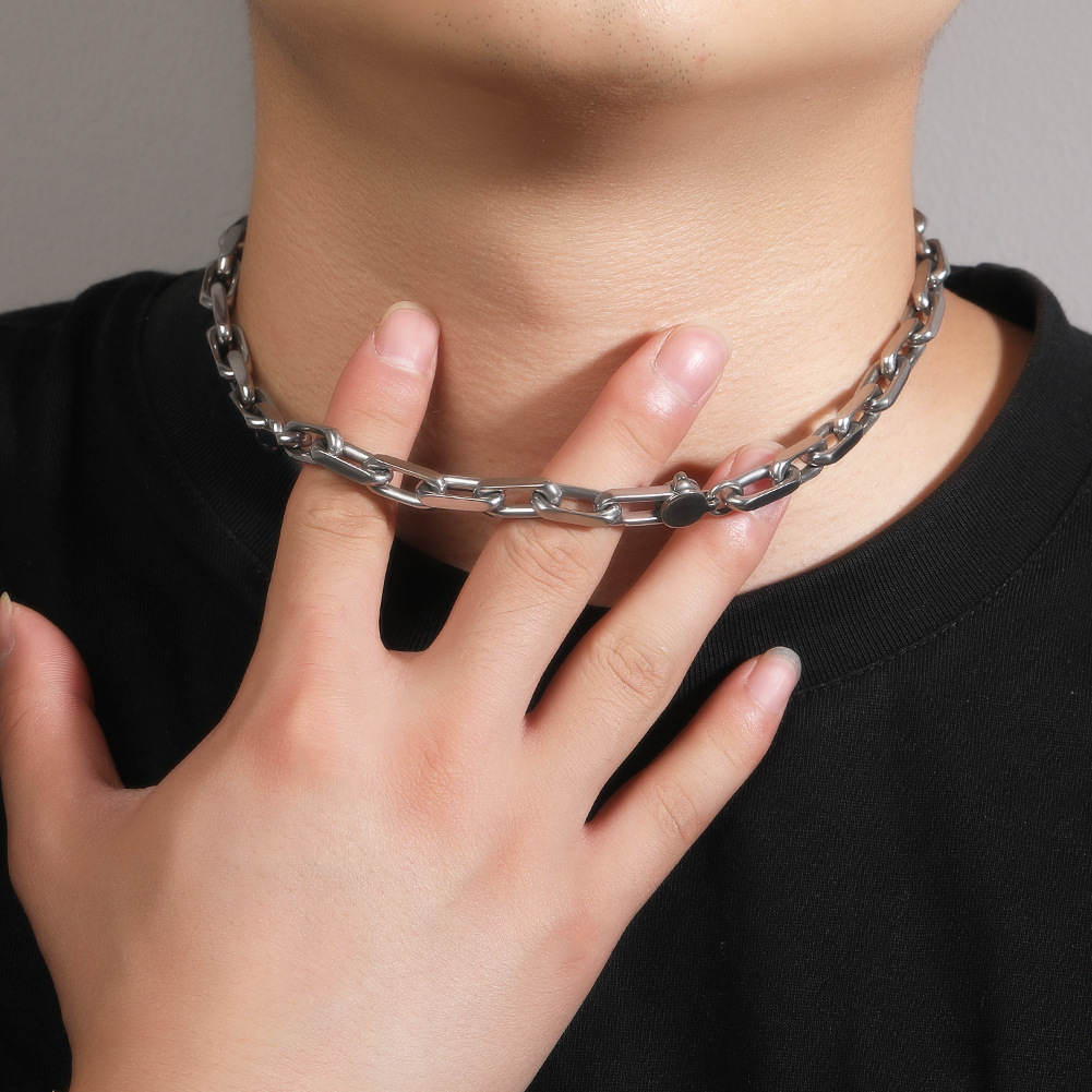 Men's Stylish Stainless Steel Geometric Necklace with Polished Square Rings and Buckles