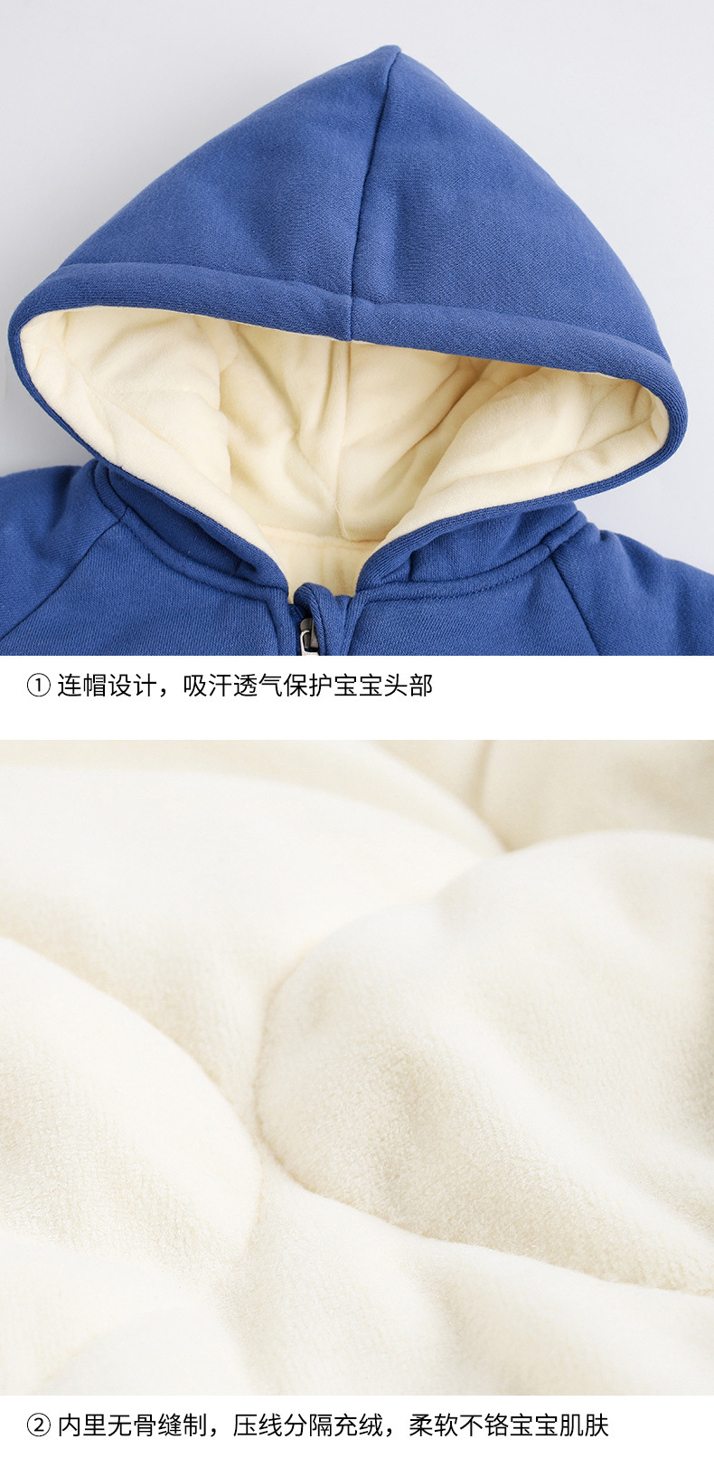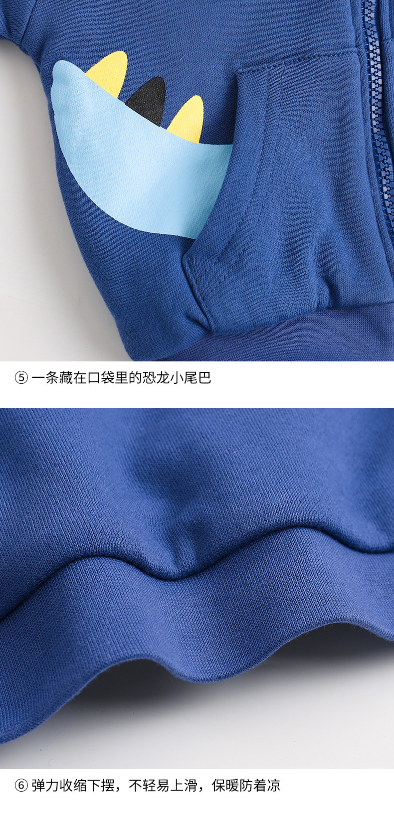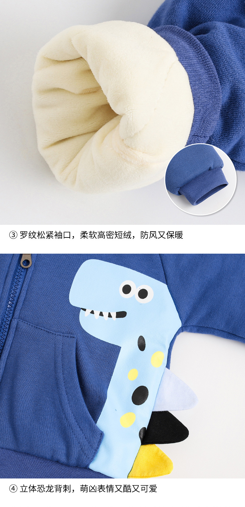 - ["Made of cotton blend, warm and comfortable","Cartoon dinosaur pattern, fashionable and cute","Zipper closure, easy to wear and take off","Long sleeve, hooded design, keep warm","Suitable for kids 1-3 years, 80-100cm"]