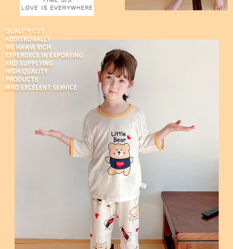 - ["Lightweight and breathable bamboo fiber material","Suitable for 3-15 years old kids","7/7 sleeve and pants design","Unique cardigan pattern","Perfect for summer home outfit"]